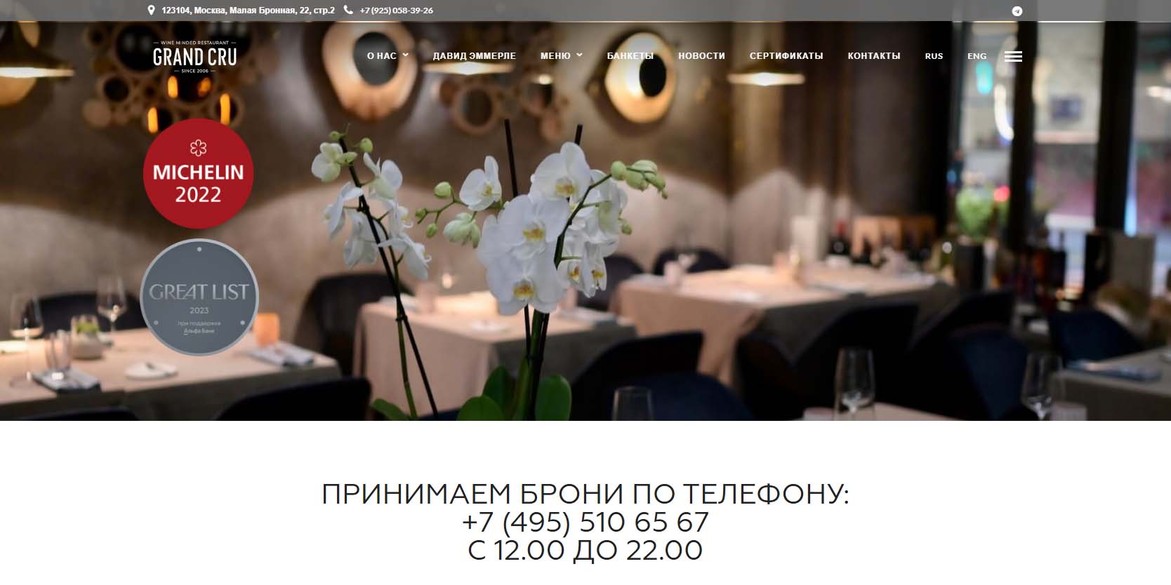 Единственный ресторан на пафосных Патриарших прудах, который удостоился звезды «Мишлен». Он всецело посвящен винам — 1000 наименований. Еще до признания известным автогидом, ресторан выигрывал иные премии, которые связаны с вниманием к этому напитку. Ресторан очень уютный, отличное место для встреч с друзьями и проведения дегустаций.
