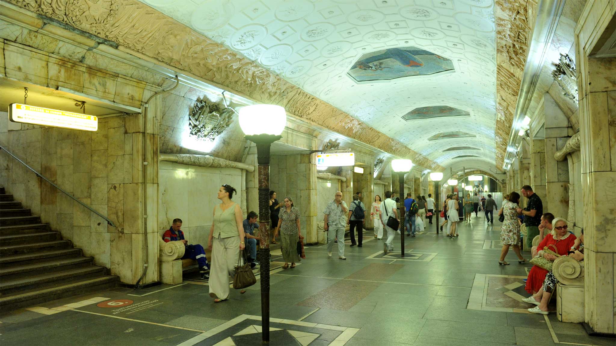 Ее убранство, скорее элегантное, чем пышное, включает некоторые авангардные элементы, отсылающие к стилю арт-деко. Неповторимыми чертами интерьера являются стальная отделка колонн и арок и 34 потолочные ниши, обрамленные светильниками и за счет этого издалека похожие на люстры. Однако если встать под ними и посмотреть вверх, то взгляду откроются панно, выполненные из смальты по эскизам знаменитого Александра Дейнеки. Сюжеты мозаик объединены общей темой — «Сутки советского неба»: на них можно увидеть прыгуна с шестом, дирижабль, бомбардировщики, монтажника-высотника и даже опоры ЛЭП.