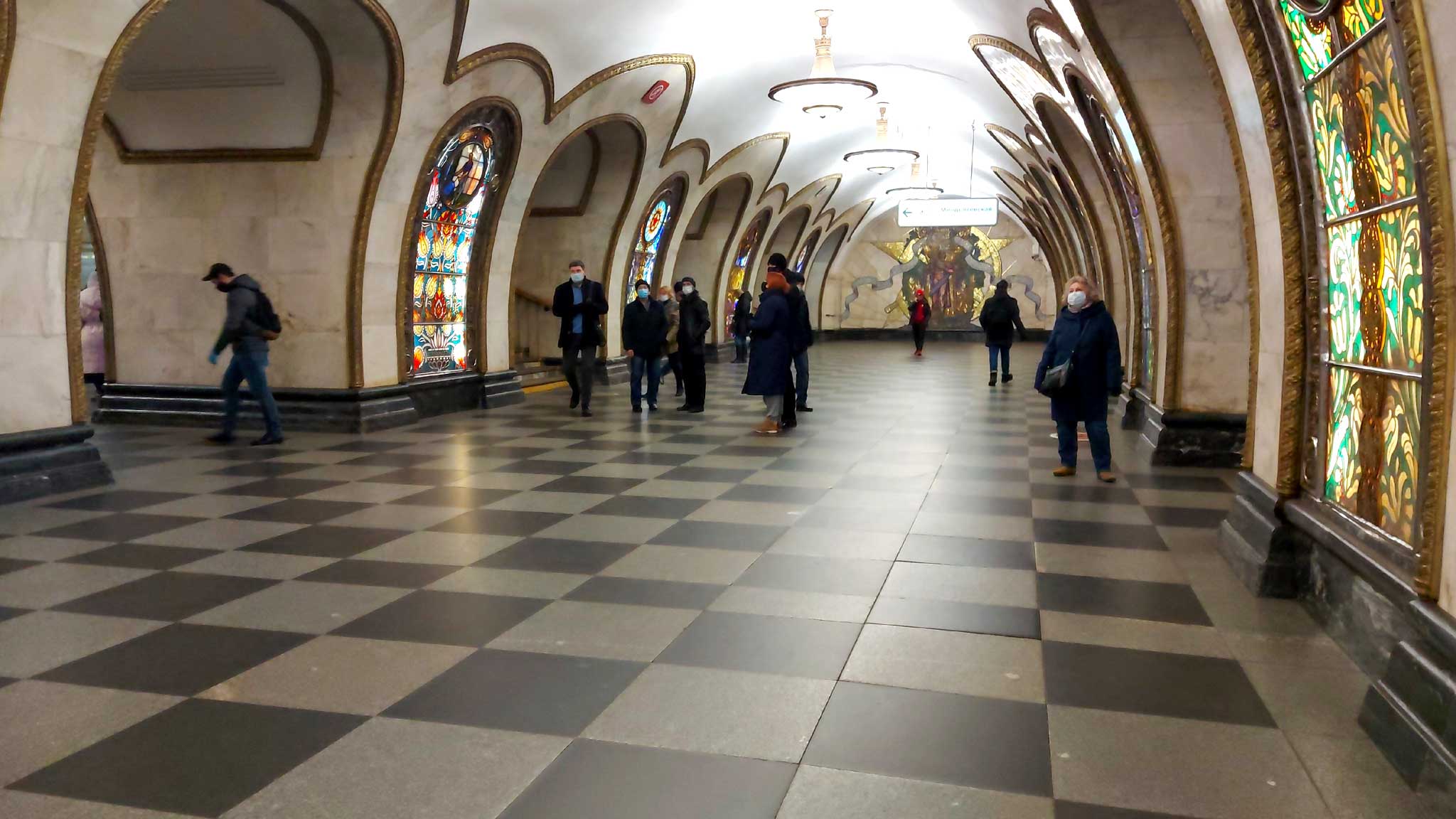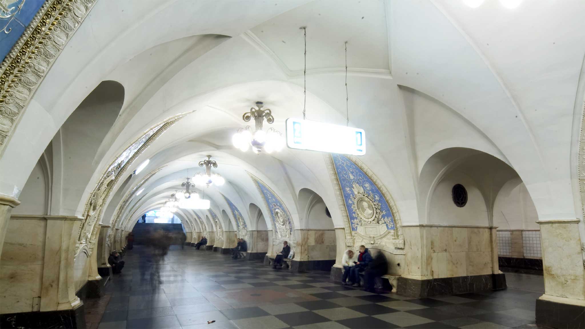 Ее убранство, скорее элегантное, чем пышное, включает некоторые авангардные элементы, отсылающие к стилю арт-деко. Неповторимыми чертами интерьера являются стальная отделка колонн и арок и 34 потолочные ниши, обрамленные светильниками и за счет этого издалека похожие на люстры. Однако если встать под ними и посмотреть вверх, то взгляду откроются панно, выполненные из смальты по эскизам знаменитого Александра Дейнеки. Сюжеты мозаик объединены общей темой — «Сутки советского неба»: на них можно увидеть прыгуна с шестом, дирижабль, бомбардировщики, монтажника-высотника и даже опоры ЛЭП.