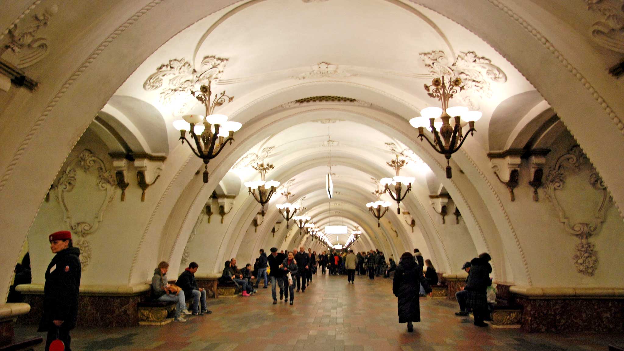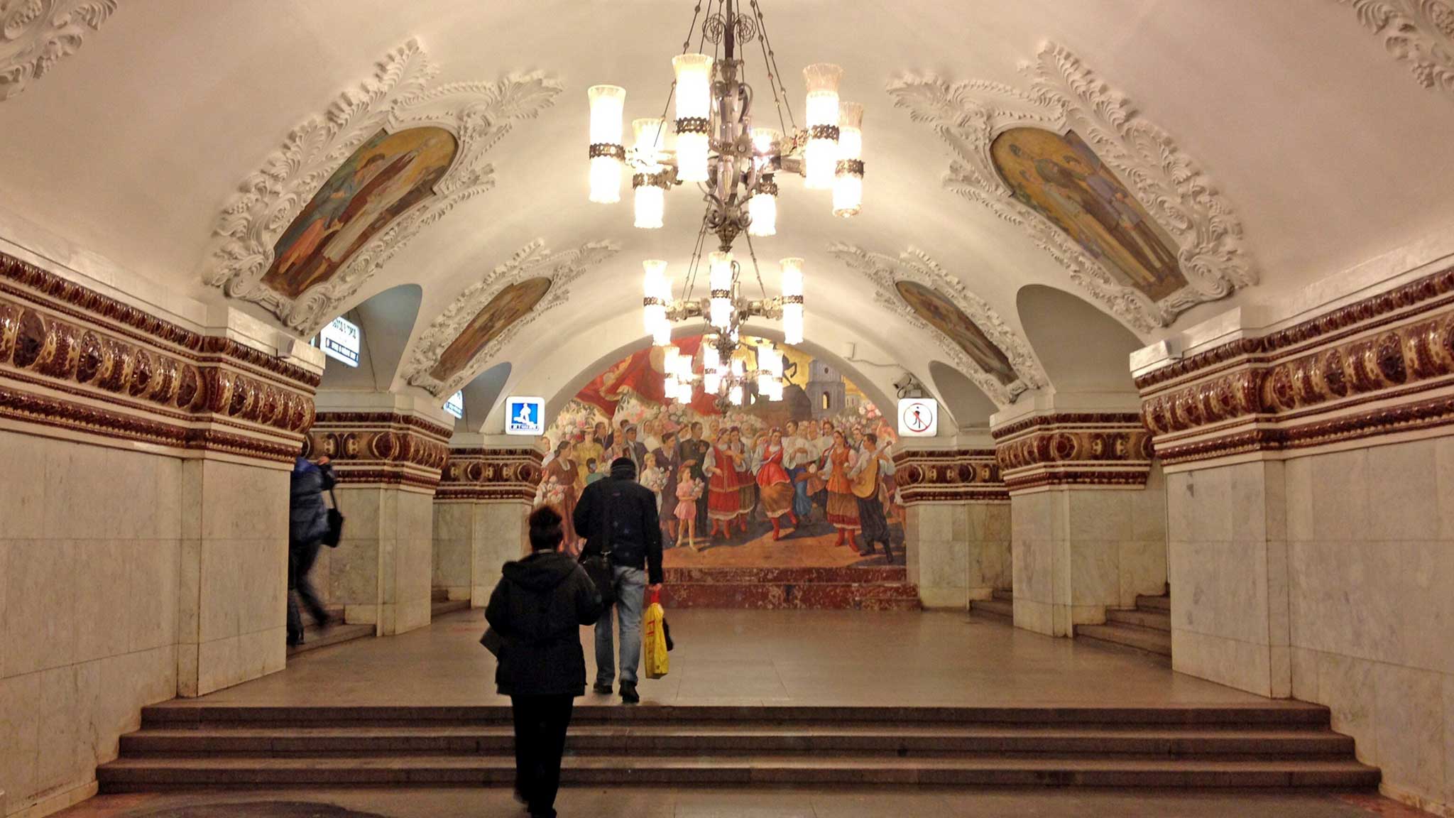 Эта станция обычно больше других впечатляет туристов, впервые оказавшихся в московском метро. Она действительно демонстрирует образец помпезной архитектуры сталинской эпохи. И это неслучайно: станция находится под Комсомольской площадью, в народе «Площадью трех вокзалов» – Ленинградского, Казанского и Ярославского. Прибывавшие в Москву люди первым делом спускались в метро и сразу же должны были быть ослеплены великолепием столицы Советского Союза.