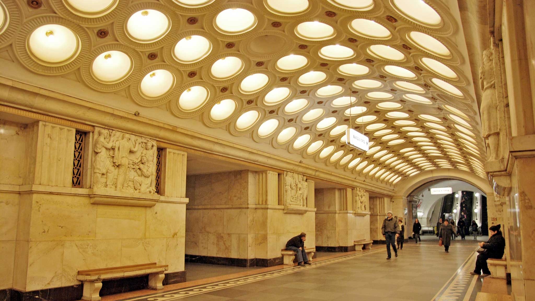 Уникальной ее делают знаменитые скульптуры, созданные под руководством Матвея Манизера. В 76 бронзовых скульптурах воплотилось 20 образов представителей советского народа: пионеры, студенты, инженер, птичница, футболист, моряк, пограничник и другие. Интересно, что сам архитектор Алексей Душкин был не в восторге от идеи разместить на станции крупные объемные формы, а настаивал на барельефах.