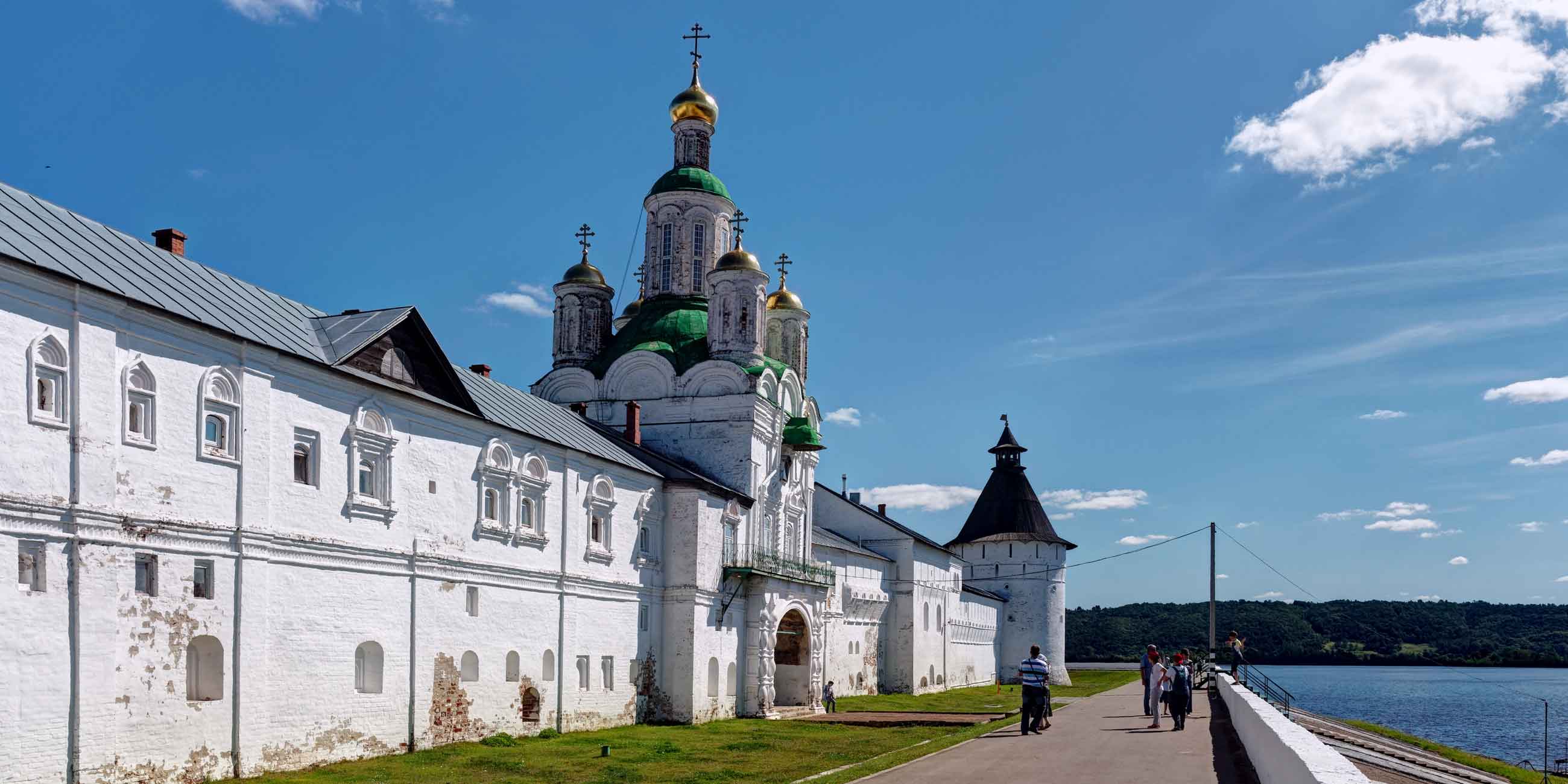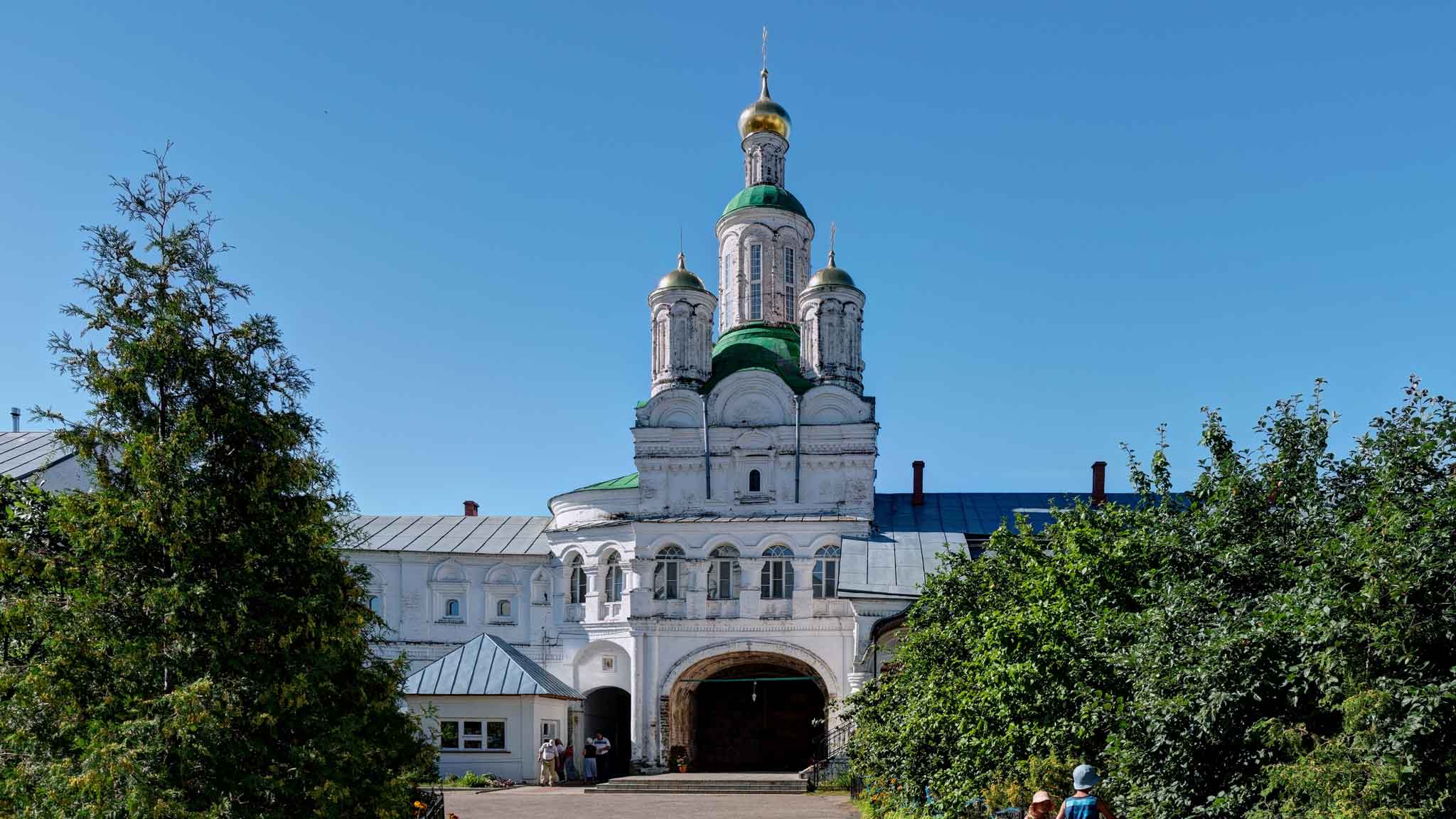 Собор во имя Святой Живоначальной Троицы. Его возвели по образцу Московского Успенского собора в 1664 году. Внутри — потрясающие древнерусские фрески, еще не полностью восстановленный золоченый иконостас, который расписали сравнительно недавно. Обратите внимание на колонны центрального зала, на них видны отметки наводнений. Самое последнее здесь случилось в 1926 году.