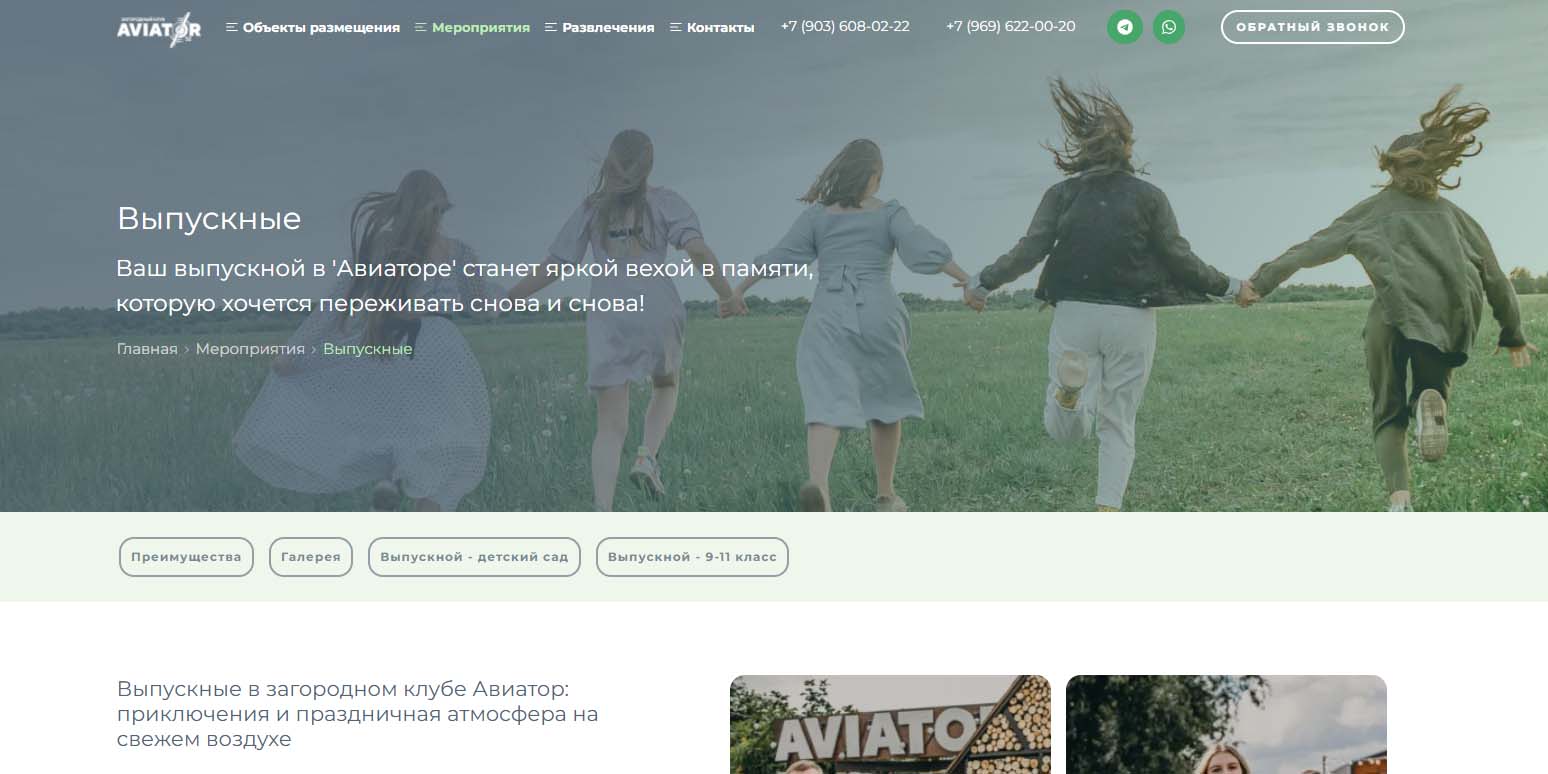 В загородном клубе «Авиатор» можно провести выпускной в уютной атмосфере и в окружении красивой природы. И это всего в 5 километрах от города. На просторной территории есть несколько банкетных залов разной вместимости, место для прогулок, красивые локации для фотосессий. Организаторы предлагают разные сценарии для выпускных — от фаер-шоу и тик-ток вечеринок до классических торжественных вариантов. Полностью берут на себя всю организацию. В стоимость выпускного входят услуги фотографов, видеооператоров, ведущих, диджеев, декораторов.
