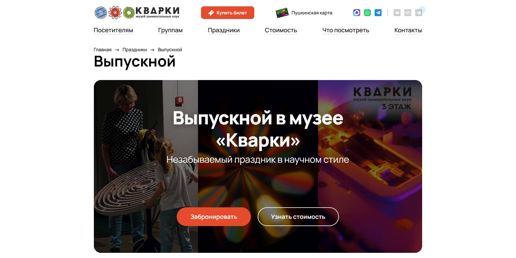 Здесь выпускной можно превратить в настоящее научное приключение. Дети не только вдоволь повеселятся, но и с пользой проведут время, узнают много нового и интересного. В программу выпускного входит научное шоу с экспериментами и квесты. Дети могут самостоятельно собирать робота, запускать механизмы, наблюдать за необычными физическими явлениями, участвовать в зрелищных опытах. Дополнительно можно организовать дискотеку, фуршет, фотосессию, показ видеороликов из жизни класса и другие яркие моменты.