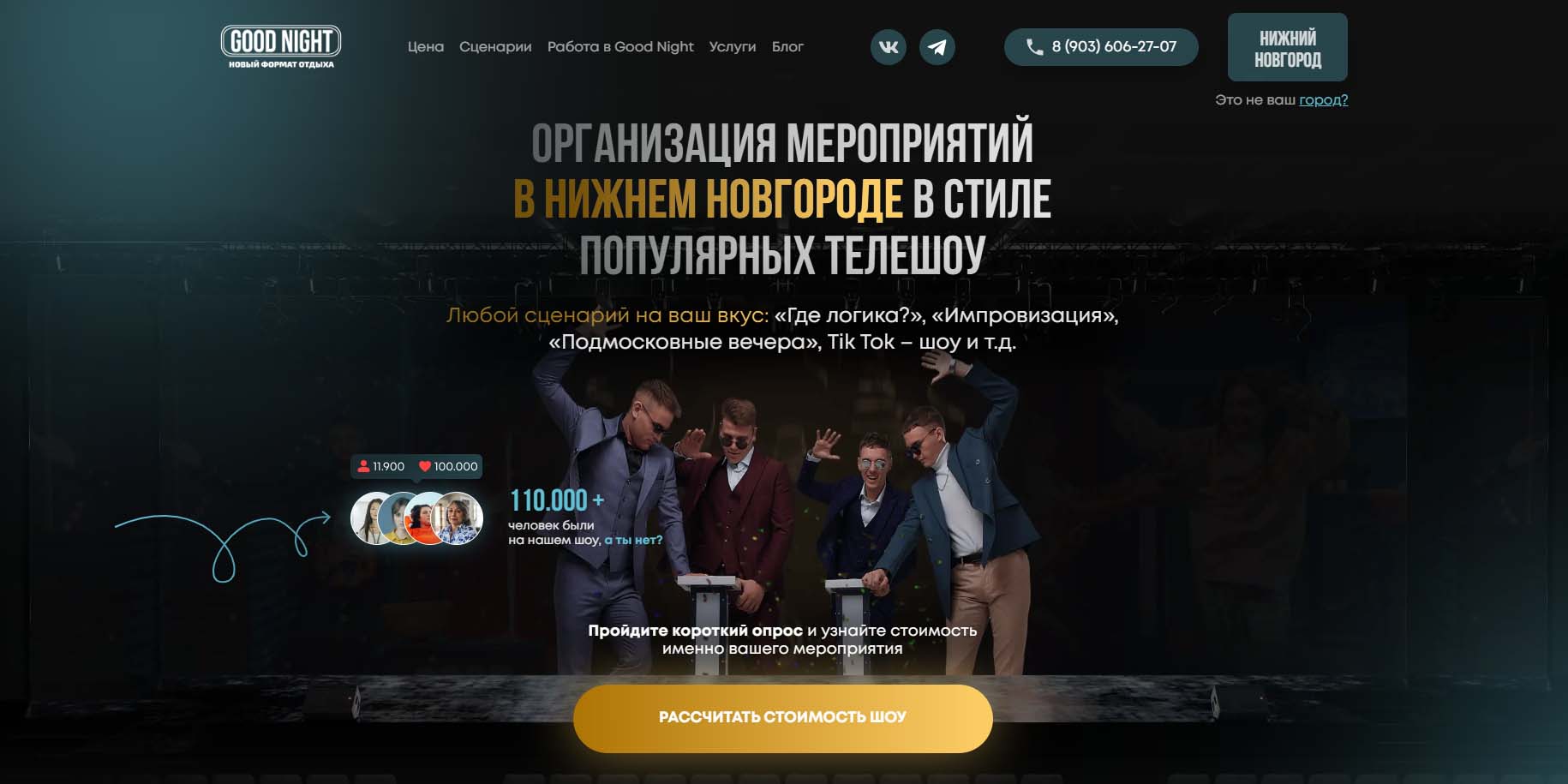 Здесь можно организовать на выпускной командную игру с ведущим в стиле телевизионных шоу. Более 7 сюжетов. Дети могут соревноваться друг с другом или сразиться с командой родителей. Скучать не придется никому. Конкурсная программа состоит из разных заданий, на которые нужно дать верный ответ. На протяжении всего шоу ребят развлекает опытный ведущий. Он помогает поддерживать приятную атмосферу и создавать нужное для выпускного вечера настроение. Good Night могут организовать и выездной праздник.