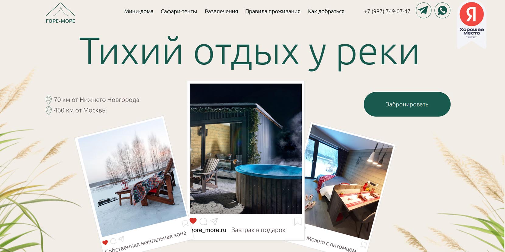 Еще один уютный глэмпинг на берегу Горьковского моря. Тут можно с комфортом отдохнуть в доме типа A-frame или барнхаус, искупаться в индивидуальной купели (вода в ней подогревается круглый год). Также на территории есть гриль-зона и русская баня.