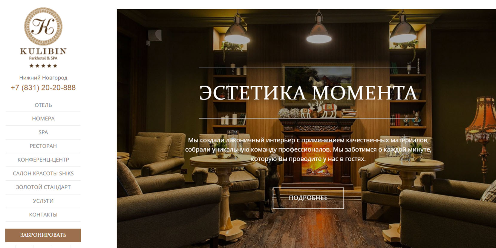 Парк-Отель «Кулибин» занимает старинное здание в центре города и граничит с уютным парком. Интерьер гостиницы выполнен в стиле арт-деко, где строгость форм сочетается с яркими цветами и современным дизайном. Для гостей с домашними животными здесь оборудованы специальные номера. В отеле можно попробовать блюда авторской кухни в ресторане «De Kas» и отдохнуть в Lobby-Lounge.