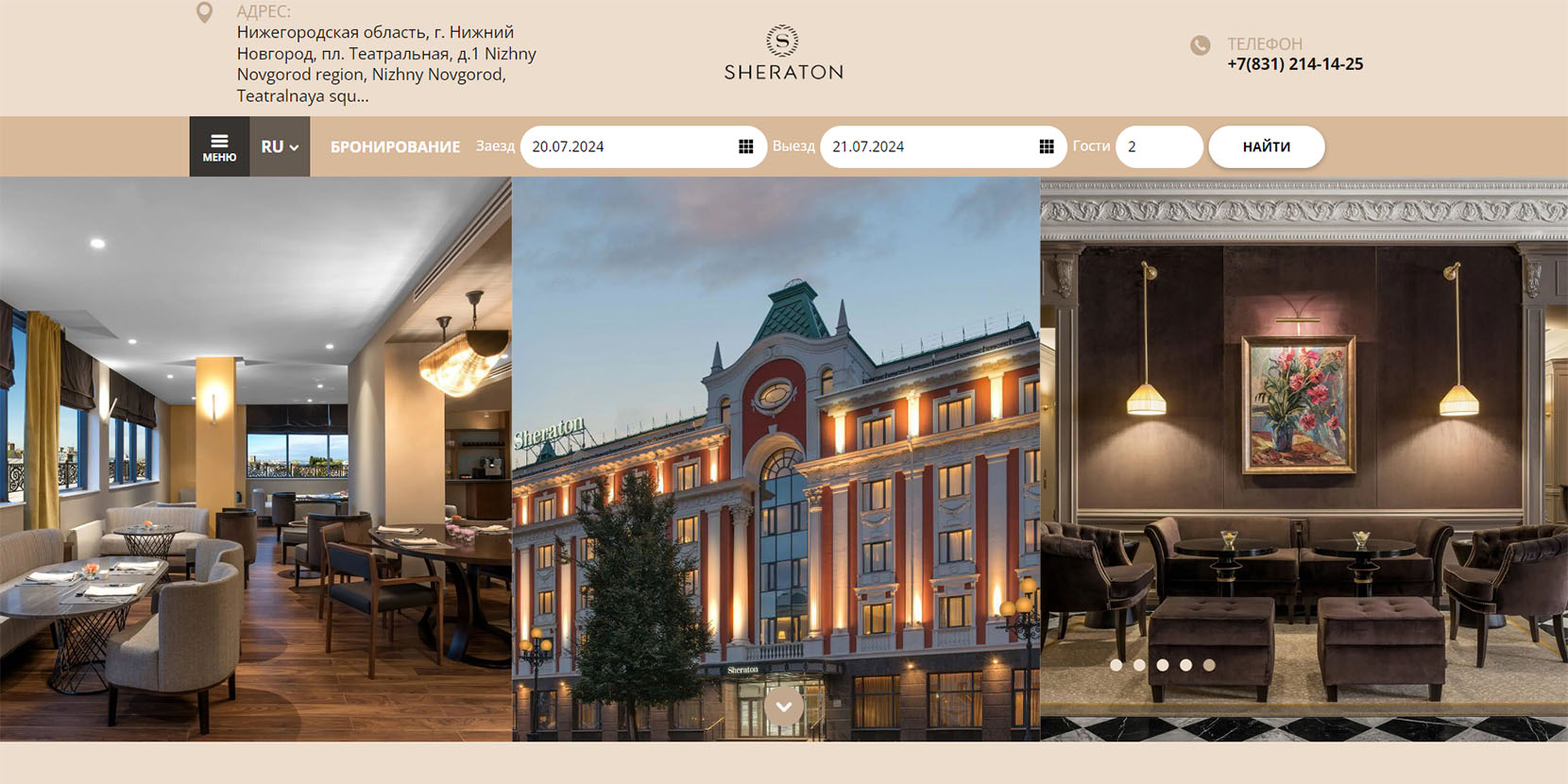 Sheraton — представитель международной сети пятизвездочных отелей в Нижнем Новгороде. Стоит на Театральной площади, в шаговой доступности от главных достопримечательностей. Отель располагает 176 уютными номерами (от стандарта до президентского люкса). Здесь работает ресторан Smorodinn Restaurant&Lounge с дизайнерским оформлением. На разных этажах расположены бары и летние террасы. В отеле есть фитнес-зал и спа-салон, консьерж-служба, прачечная, химчистка и бизнес-зона для деловых встреч и переговоров.