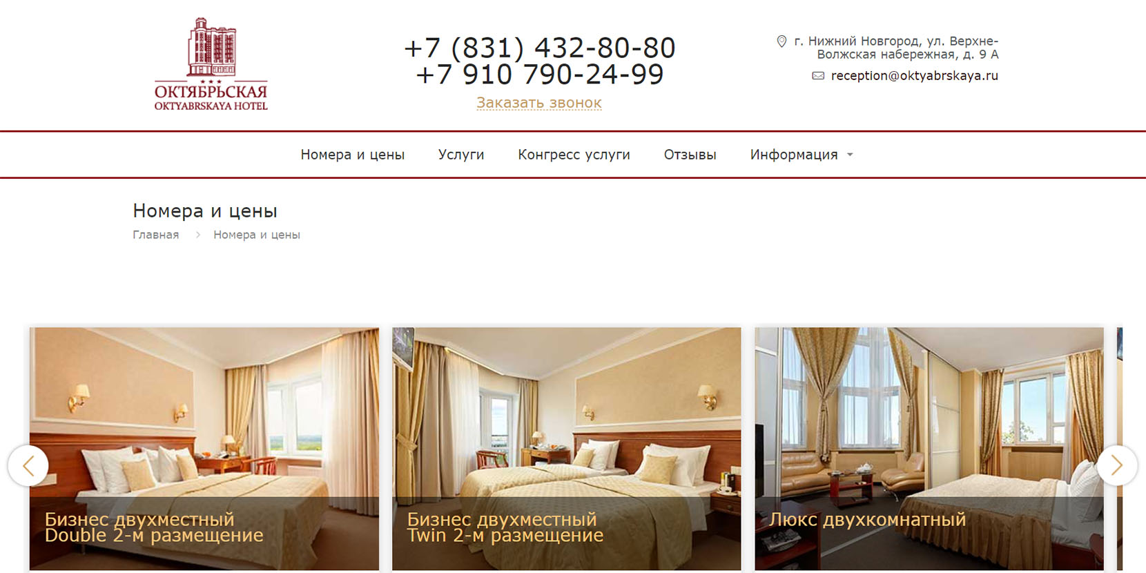 Гостиница «Октябрьская» подойдет тем, кто ищет оптимальное сочетание цены и качества. Из большинства номеров открывается живописный вид на Волгу. Всего в отеле 92 номера с современной мебелью и отделкой: семейные, студии, люкс и стандартные. При отеле работает ресторан с европейской и русской кухней, а также есть конференц-зал для проведения мероприятий.