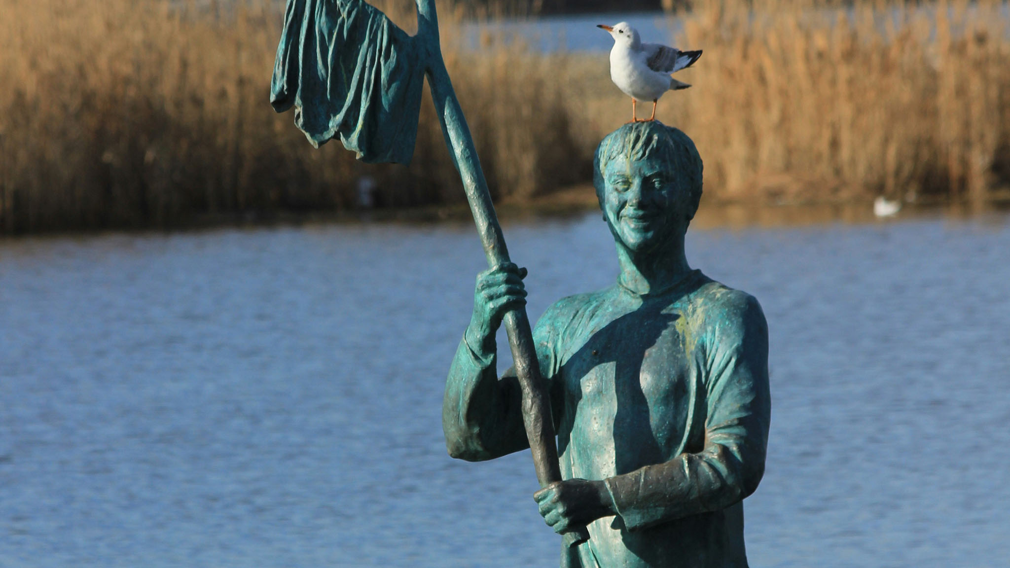 Бронзовый Козодоев стоит прямо в воде между пляжем на косе и мемориалом «Малая земля».
