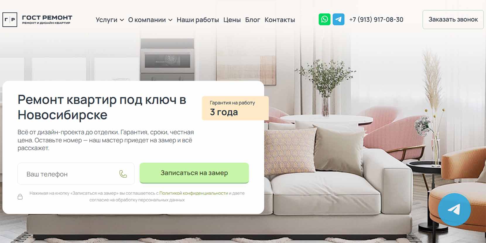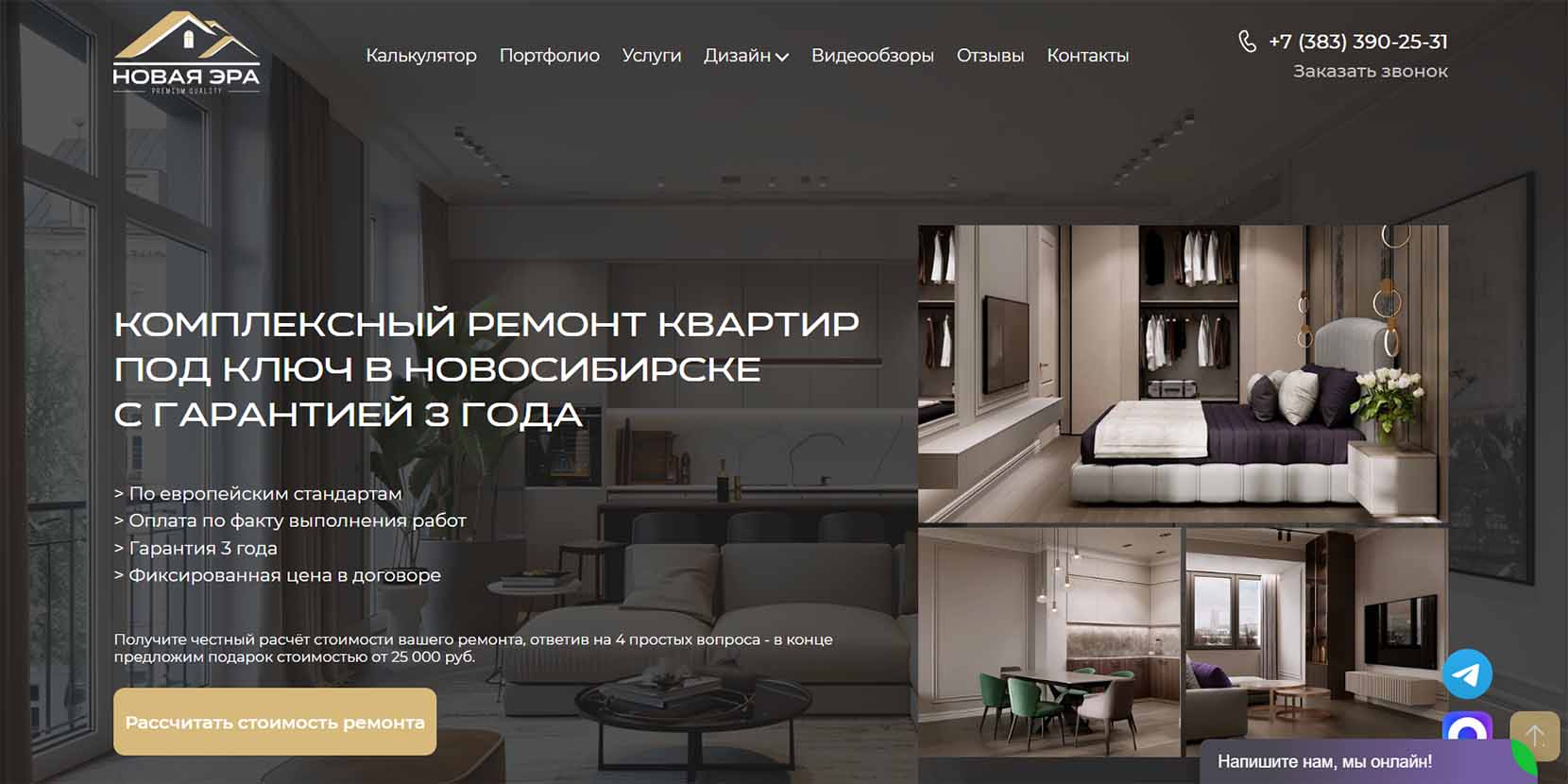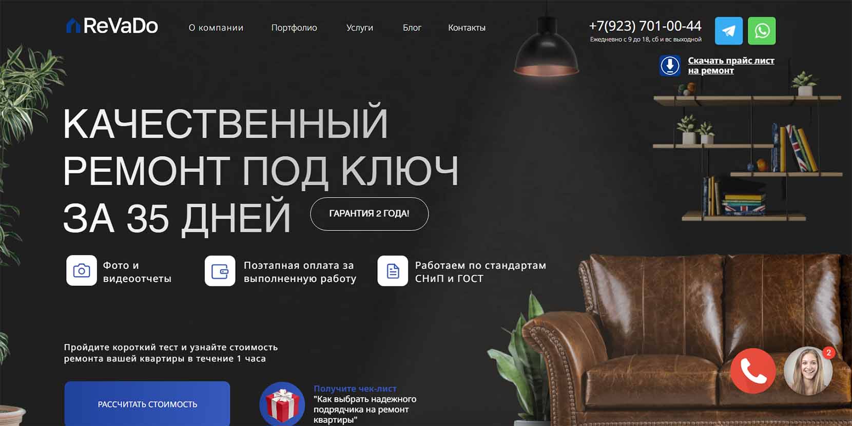 Компания предлагает комплексный ремонт под ключ с гарантией 3 года. Более 500 клиентов уже воспользовались ее услугами и оставили положительные отзывы о сотрудничестве. Мастера выполняют ремонт любой сложности — от косметического до премиум варианта. Также среди услуг — разработка дизайн-проекта с визуализацией, приемка квартиры у застройщика. Эксперт проверяет качество по 35 пунктам. За процессом ремонта можно наблюдать через фото- и видеоотчеты.