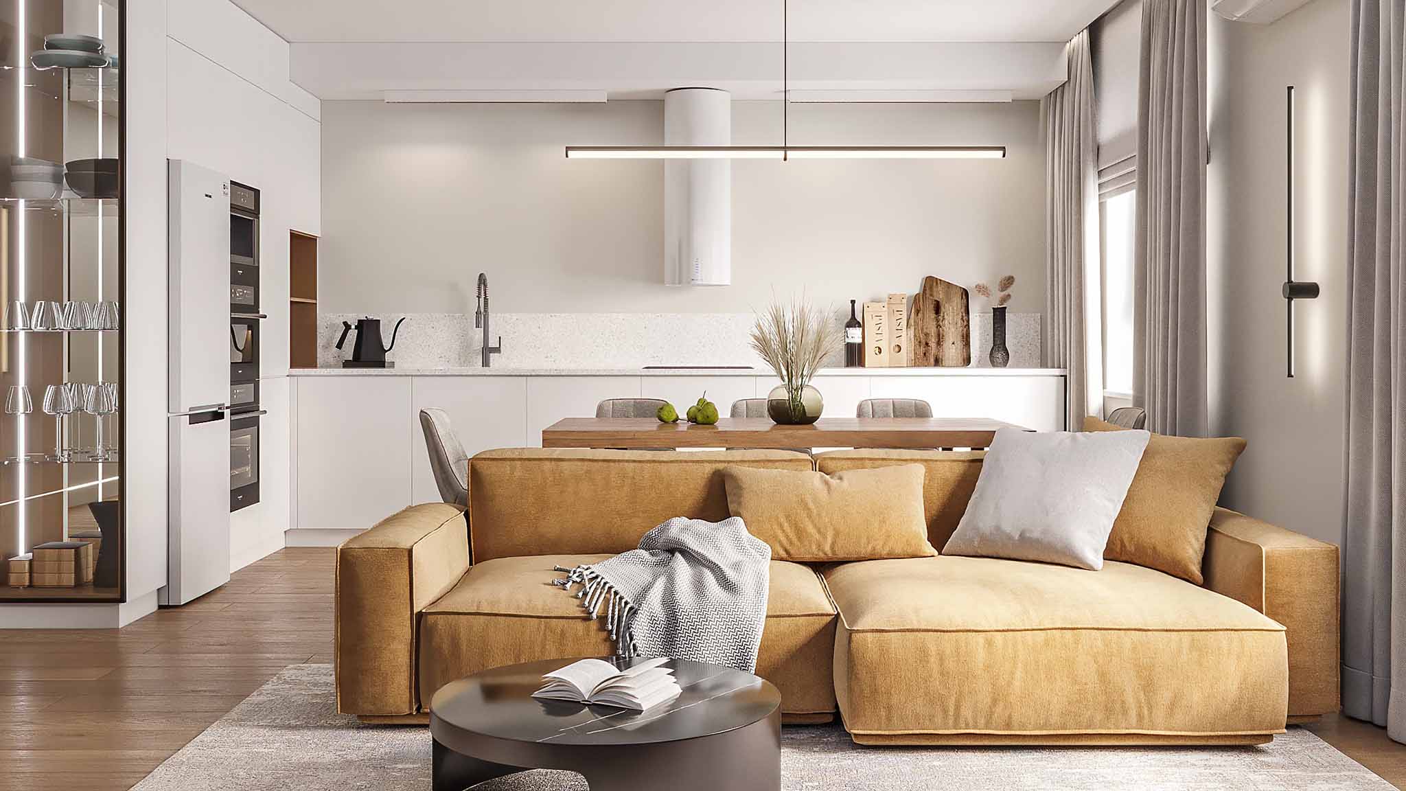 Хотя студия была открыта только в 2019 году, ее основатель — дизайнер с 14-летним опытом работы. Здесь специализируются не на трендах и модных веяниях, а на создании сдержанных спокойных интерьеров, актуальных вне времени. Немало внимания уделяется продуманной планировке и разным сценариям освещения, делающим квартиру функциональной и уютной.