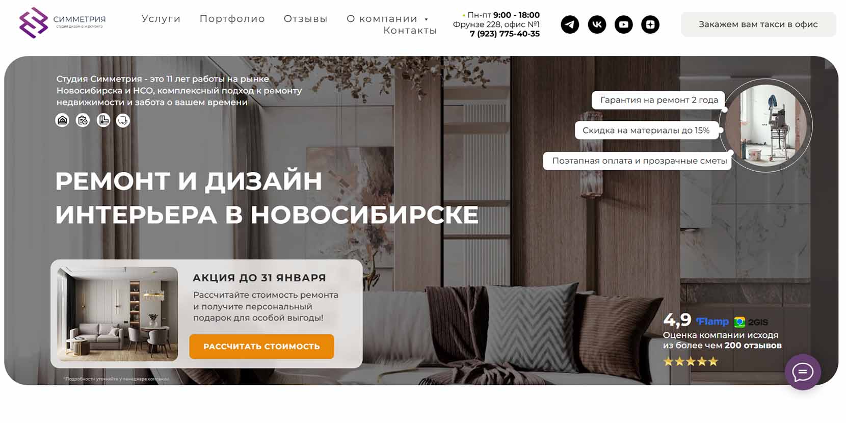 Компания начинала путь с выполнения ремонтных работ, набралась опыта и уже более 12 лет специализируется на проектировании интерьеров. Клиентам предлагают несколько пакетов услуг, подходящих под разные задачи и разный бюджет. Создание дизайн-проекта занимает не более полутора месяцев. Дизайны отличают светлые тона, натуральные материалы, сочные акценты. Берутся за удаленные проекты, когда объект находится за пределами Новосибирска. Студия сотрудничает с проверенными ремонтными бригадами.