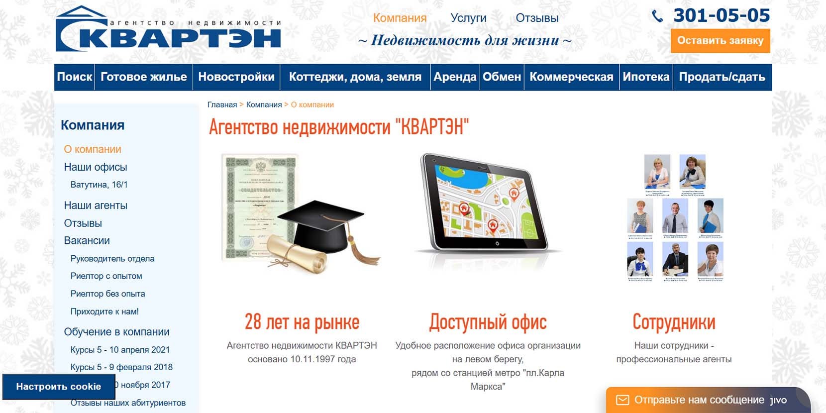 Агентство недвижимости работает с 1994 года и за это время успело провести более 30 тыс. сделок. В штате — 150 квалифицированных риэлторов. Компания специализируется на покупке, продаже, обмене, аренде жилья и коммерческой недвижимости. Сотрудничают с 24 банками-партнерами. 8 филиалов агентства удобно расположены в разных районах Новосибирска. Утверждают, что до 40% клиентов приходят к ним по рекомендации или повторно.