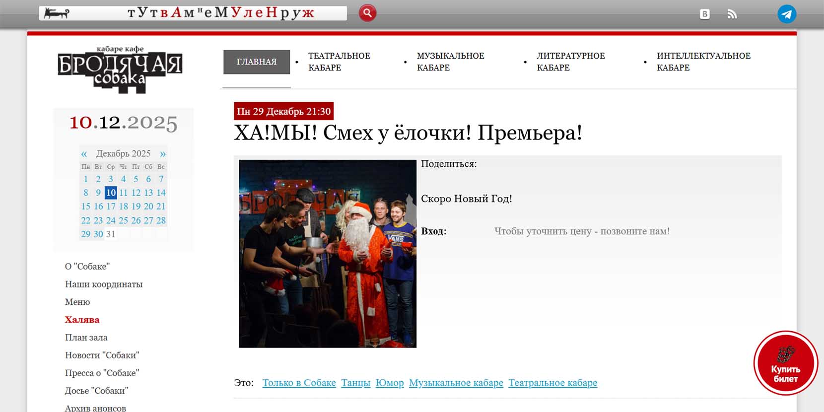 Кабаре-кафе с расслабленной и почти домашней атмосферой. Но отметить здесь праздник смогут только взрослые. Сюда несколько раз в месяц с гастролями приезжают российские и зарубежные музыканты, проводятся квизы и викторины, а еще выступает местная группа «Ха!Мы!». Под Новый год они вспоминают лучшие свои номера в жанре стеб-арт.