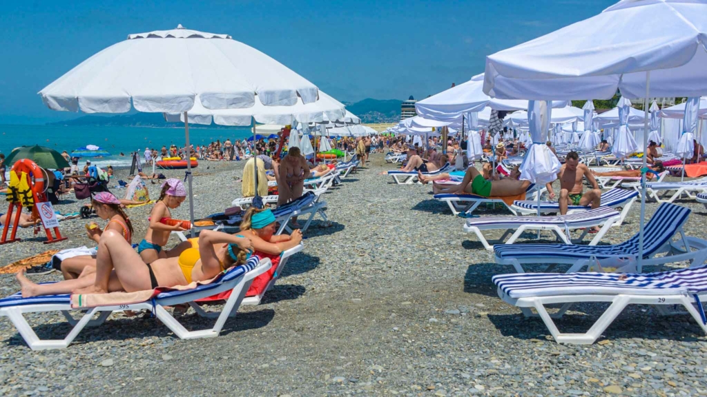 К центральному пляжу в Сочи тянутся сотни туристов. Все желают получить порцию солнца. Еще 24 июня новости с курорта были похожи на сводки с фронта из-за непогоды. Но постепенно побережье приводят в порядок: потрепанные гравийные пляжи причесали, вернули зонтики и лежаки. На фоне лазурного неба и бирюзового моря их белизна выглядит роскошно.