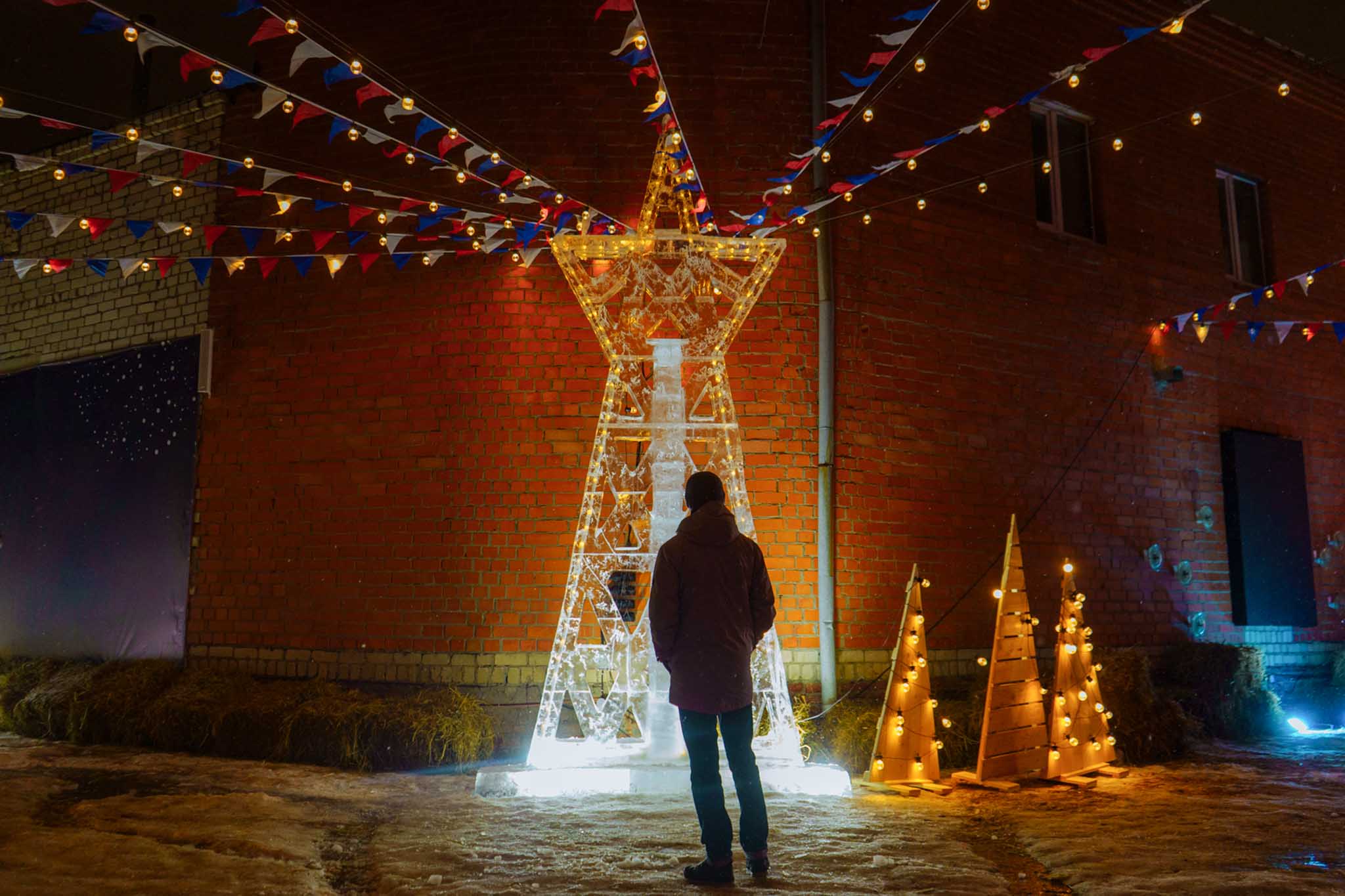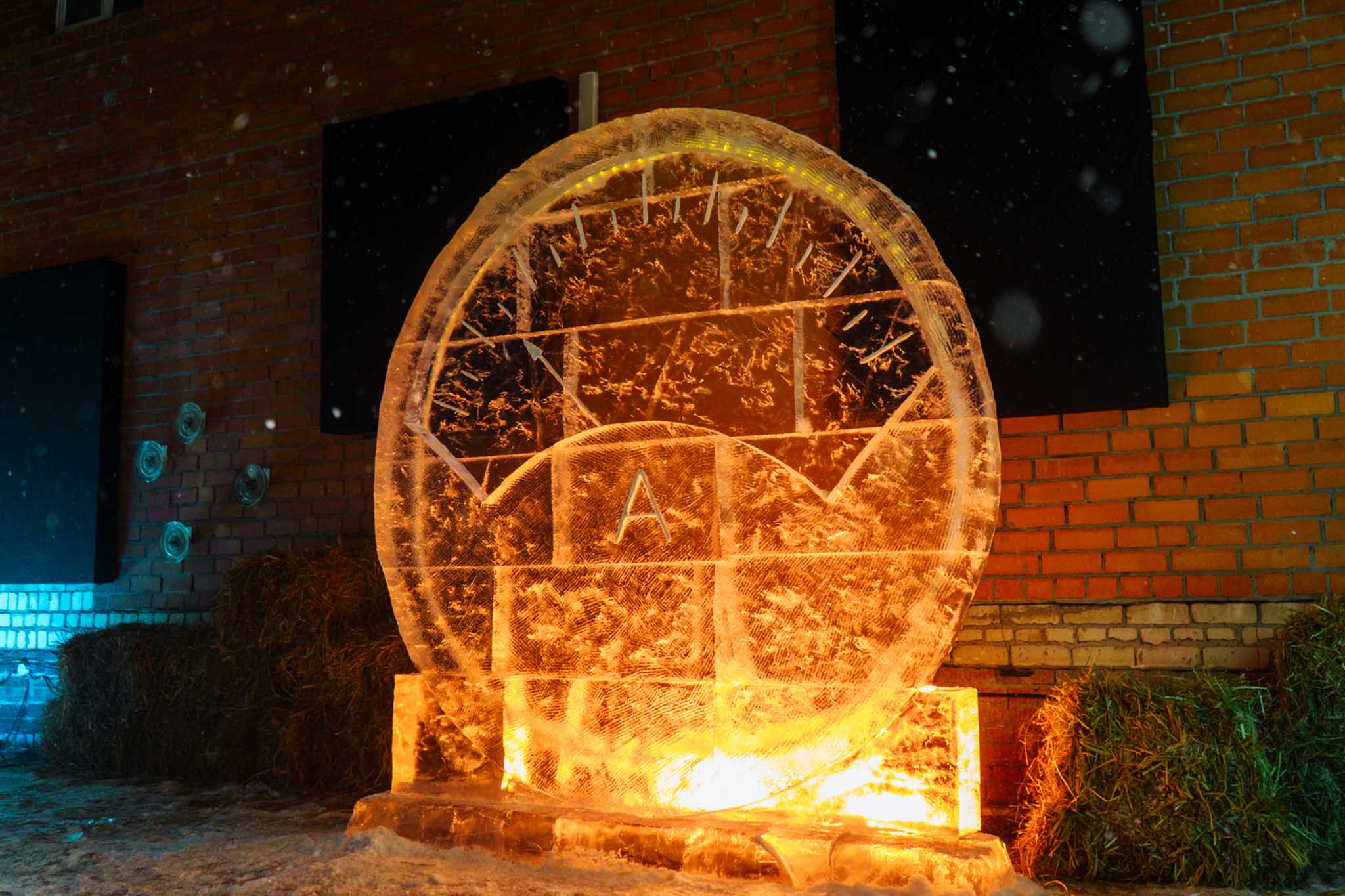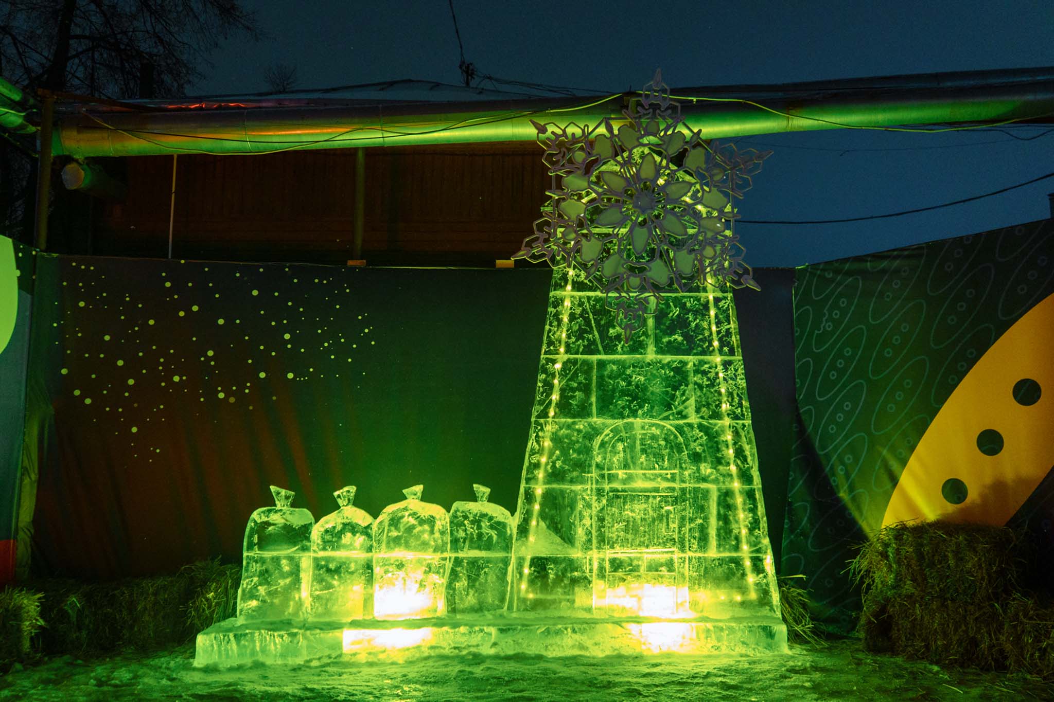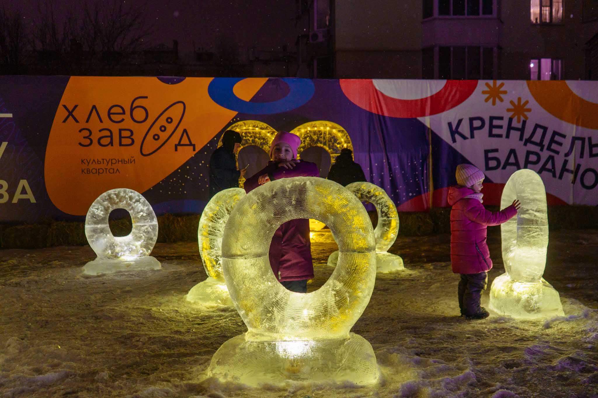 В творческую бригаду под руководством Юрия Мистрюкова вошло больше десятка человек: четверо художников и семь резчиков по льду. Мастера вдохновлялись суровой тематикой истории локации: хлебозавода и находившейся на его территории в императорскую эпоху первой городской электростанции. Так из-под резцов вышли ледяное сито и ЛЭП, прозрачные бутерброд и стакан молока, ажурная мельница и лампочка, крендель и баранки.