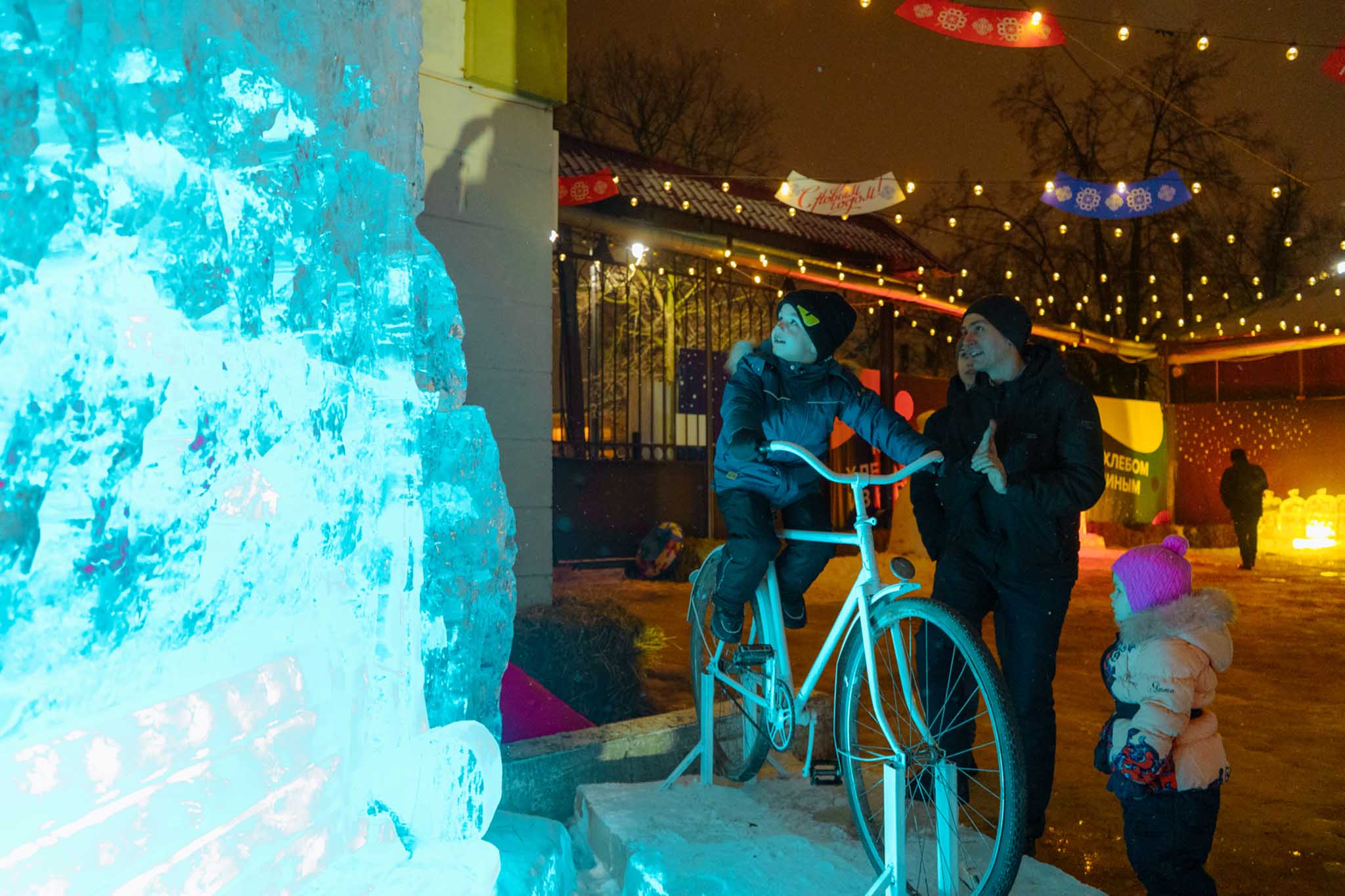Впервые на выставке появилась интерактивная зона — найдите велосипед, припаркованный у ледяной лавочки под фонарем: если покрутить педали, фонарь замигает приятным теплым светом.