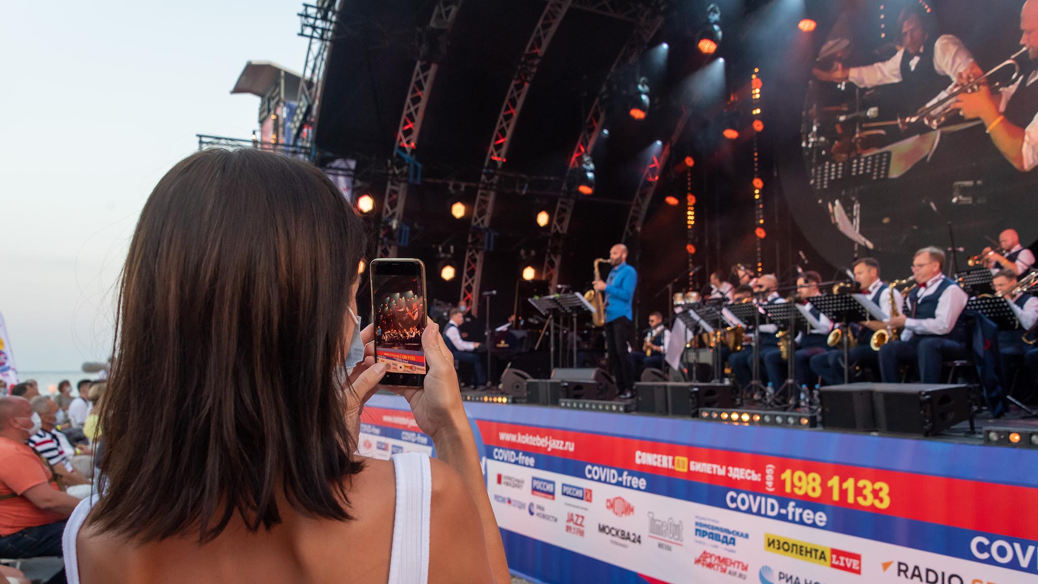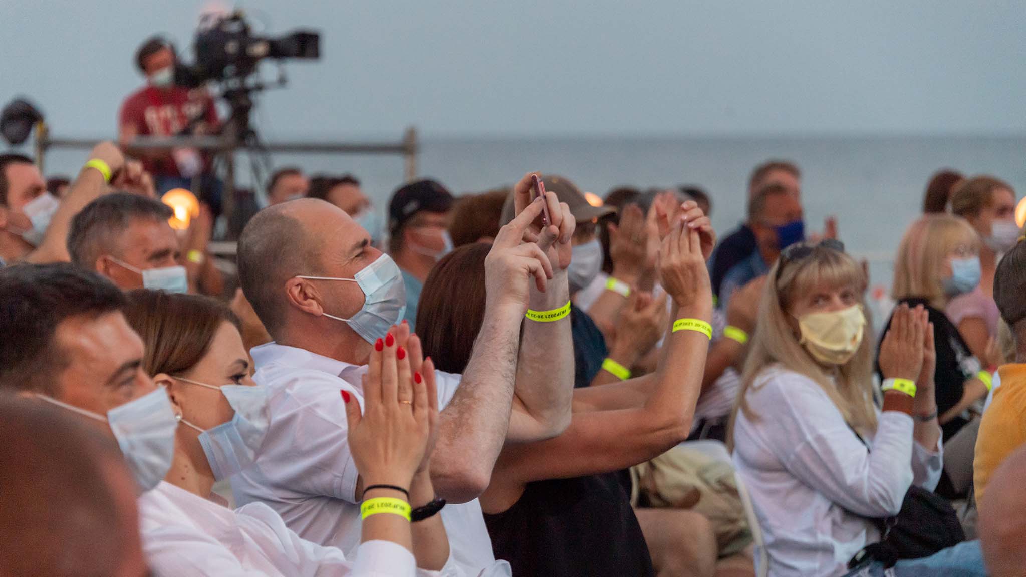 На сцене у моря тем временем готовились к вечернему шоу артисты. Репетиции музыкантов, в отличие от закрытого фестивального концерта, могли услышать все отдыхающие на окрестных пляжах. А вечером народ доказал, что импровизировать могут все. Чтобы не нарушать антиковидные правила, к семи часам сторонние зрители занимали места за пределами площадки фестиваля. Дистанция солидная, но качество звука, работа осветителей настолько высокого уровня, что слышно и видно было всем.