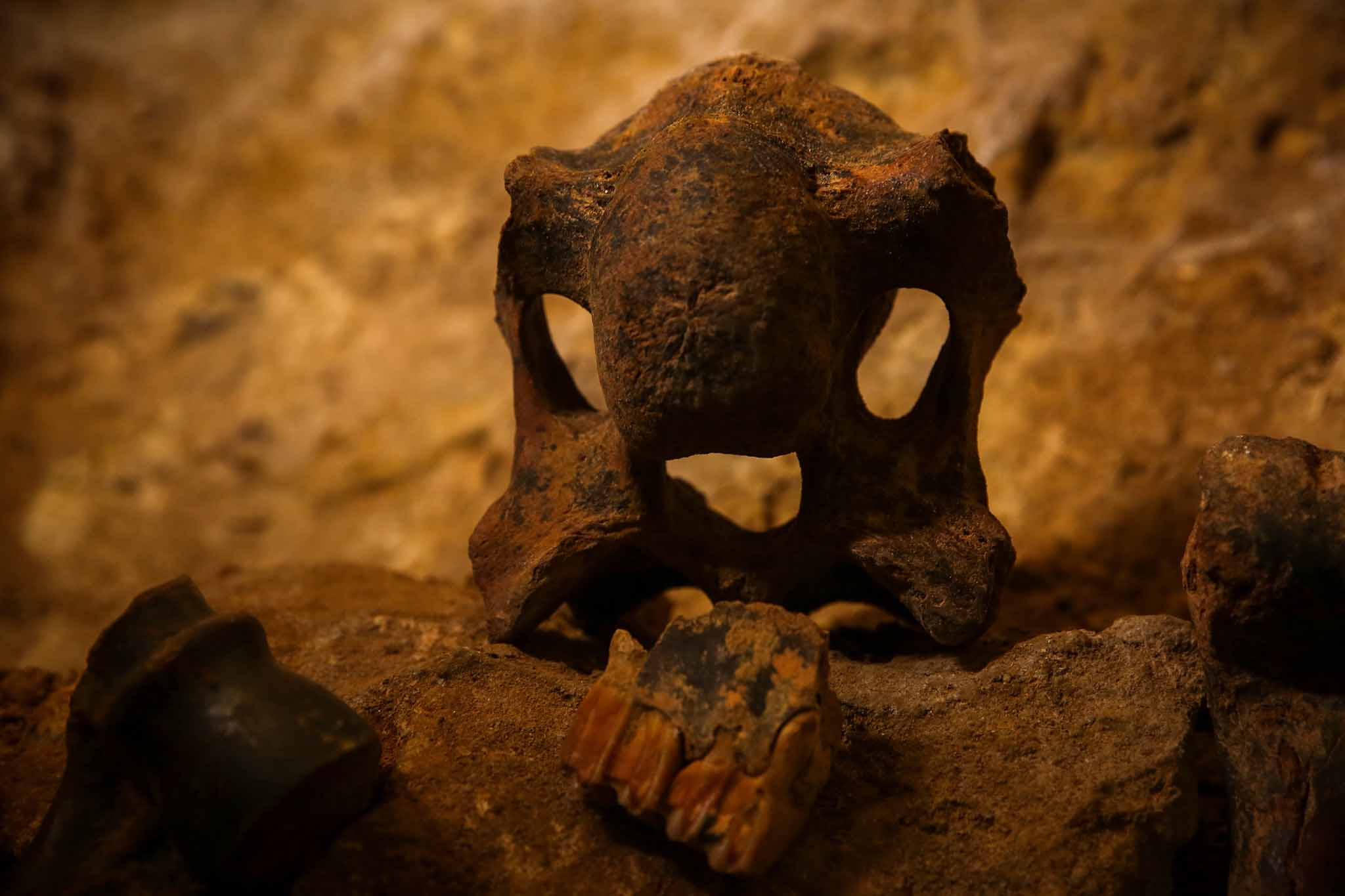 В пещере нашли целое кладбище останков редчайших древних животных. Только на разведывательном этапе откопали порядка 250 кг костей. Это были южные слоны с 4-метровыми бивнями, которые считаются древнее мамонтов,, саблезубые кошки, достигающие 1,1 метра в холке и весом под 200 кг, 3,5-метровые носороги Мерка, большерогие олени, гигантские гиены и страусы, верблюды, койоты, дикобразы, бараны, медведи, жирафы. Возраст останков — от 80-100 тысяч лет до 1,6 млн лет. Сохранились они очень хорошо, поскольку пещера около полутора миллионов лет была законсервирована.