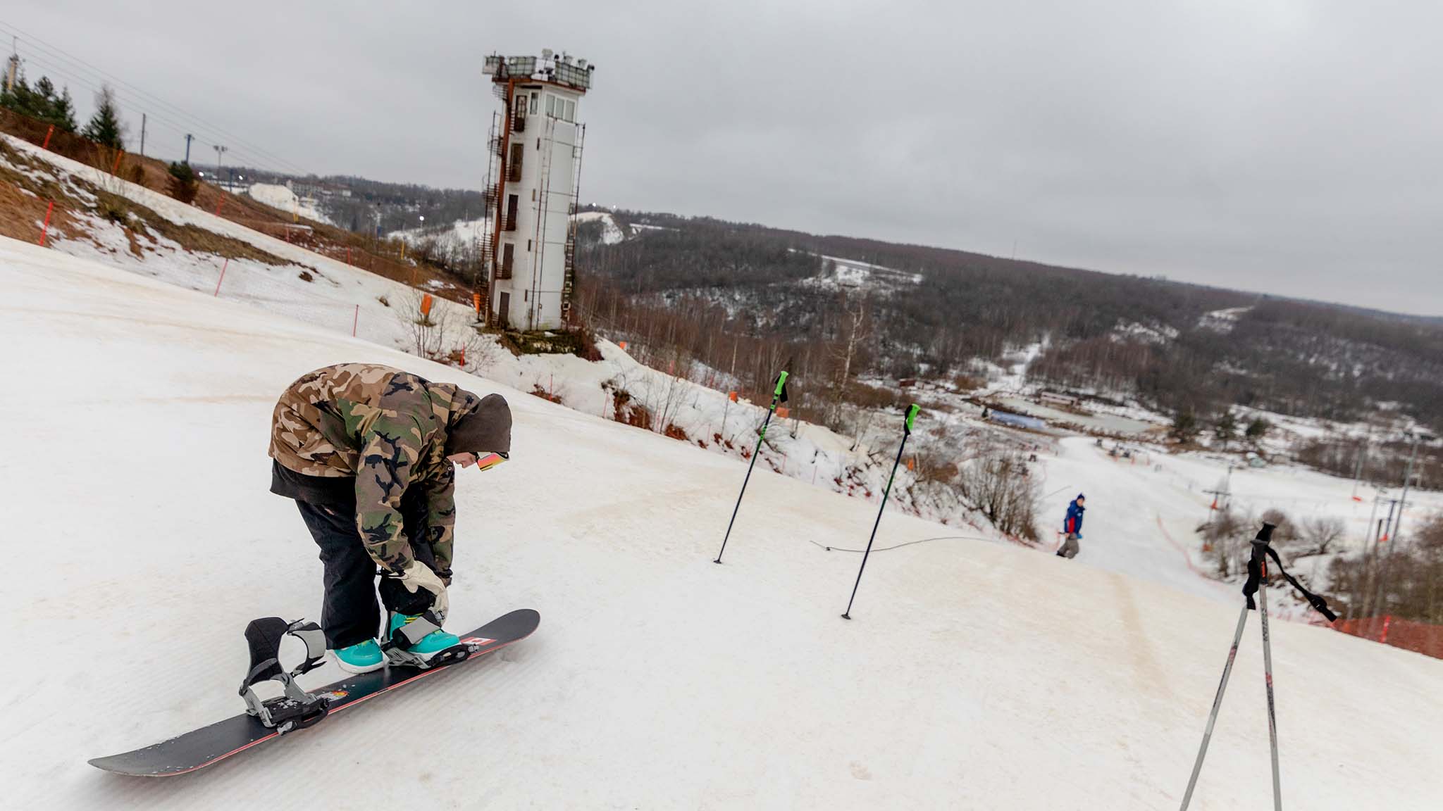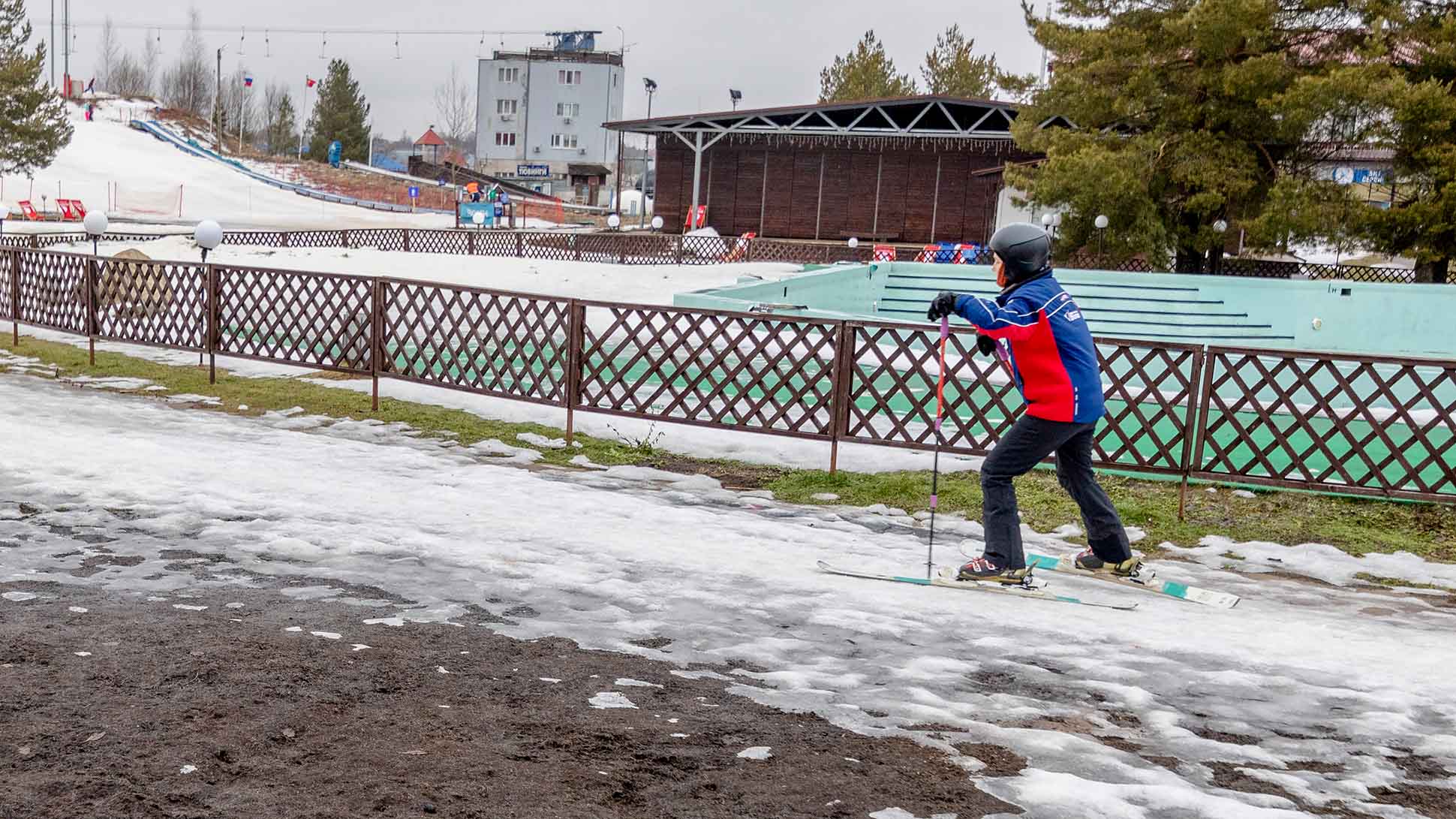 Выхожу ранним утром из дома на востоке Москвы. Подвальный кот на траве катается. У лавочки пара бутылок из-под пенного, побитых росой. Верный признак, что минувшая ночь была вполне пригодной для посиделок на свежем воздухе. Спустя километров десять от МКАД в лесу начинает встречаться снег — такой же робкий, как на картинах Саврасова. Едем в Яхрому — горнолыжный центр Подмосковья.