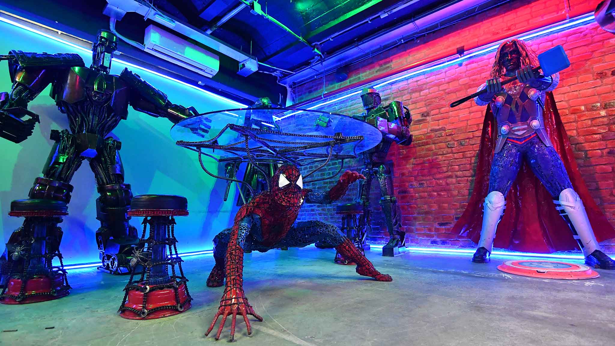 На площади свыше полутора тысяч квадратных метров разместились восемь тематических залов. В них можно познакомиться с автоботами и десептиконами, увидеть лабораторию Тони Старка и разглядеть супергероев MARVEL и DC, Терминатора, мифических животных, аниматронных роботов, персонажей фильмов ужасов, различные мотобайки и культовые транспортные средства из известных блокбастеров — «Призрачный Гонщик», «Безумный Макс».