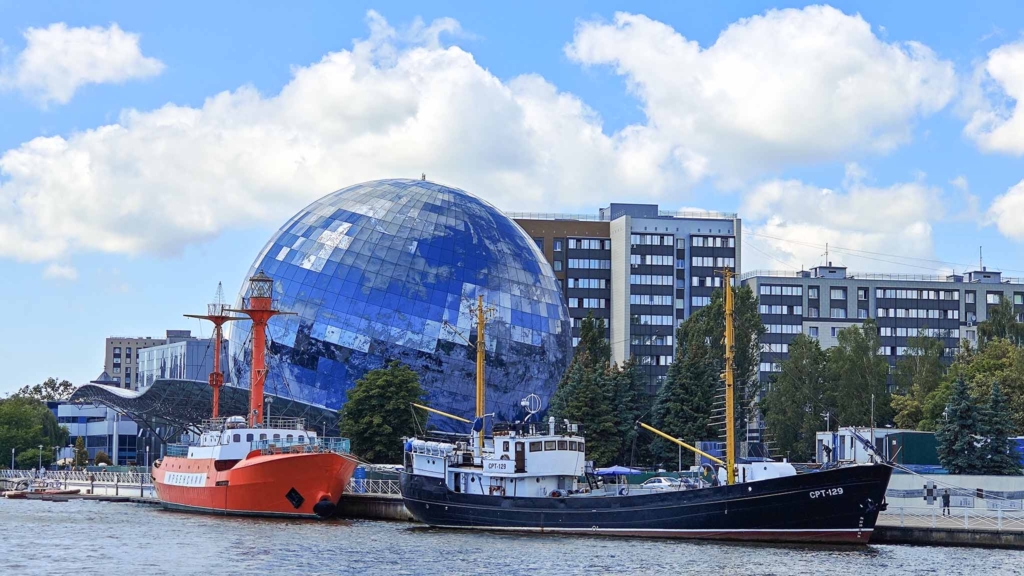 Здание экспозиционно-образовательного центра «Планета Океан» за внешний вид в народе называют просто — «шар» или ласково — «шарик». На самом деле, корпус состоит из двух геометрических фигур: стеклянной сферы, в которой размещены экспозиции, и куба, где располагается образовательный комплекс «ОКЕАНиЯ». Последний начал работу еще весной. В нем находятся морские классы и штаб-квартира Калининградского отделения РГО. Школьники и студенты здесь могут посещать лекции и занятия, встречаться с учеными.
