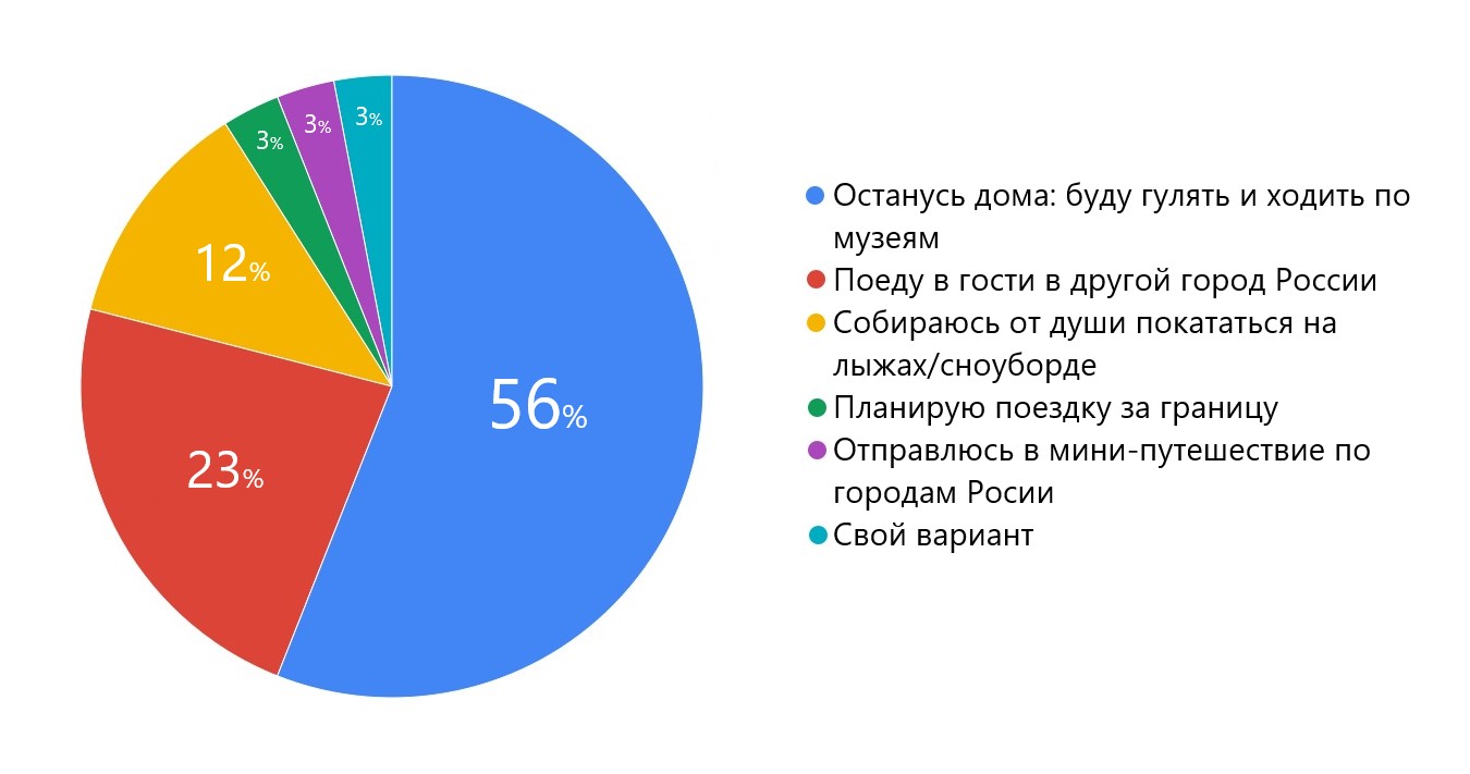 Второй по популярности ответ — «поеду в гости в другой город России». 12% респондентов оказались активными отдыхающими и запланировали катания на горнолыжных курортах.
