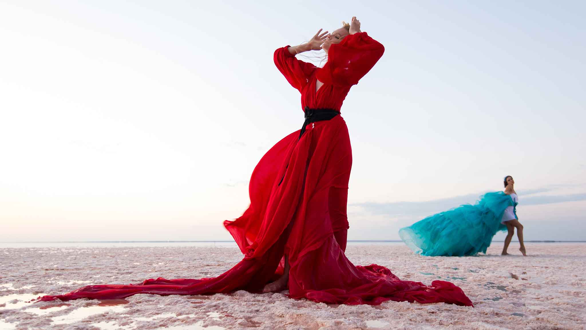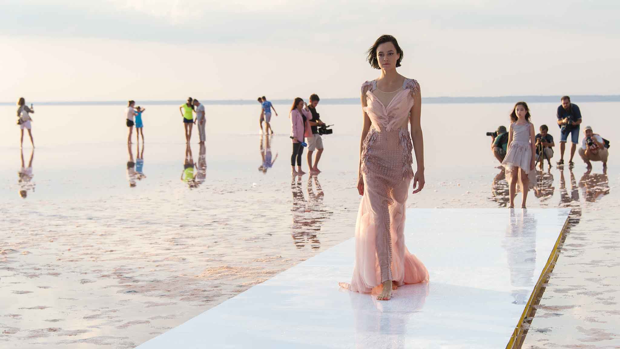 Розовое озеро в Крыму Сасык-Сиваш впервые стало подиумом для моделей. Отражение солнечных лучей от нежно-розовой глади воды стало фоном для моделей проекта Crimean Fashion Week.