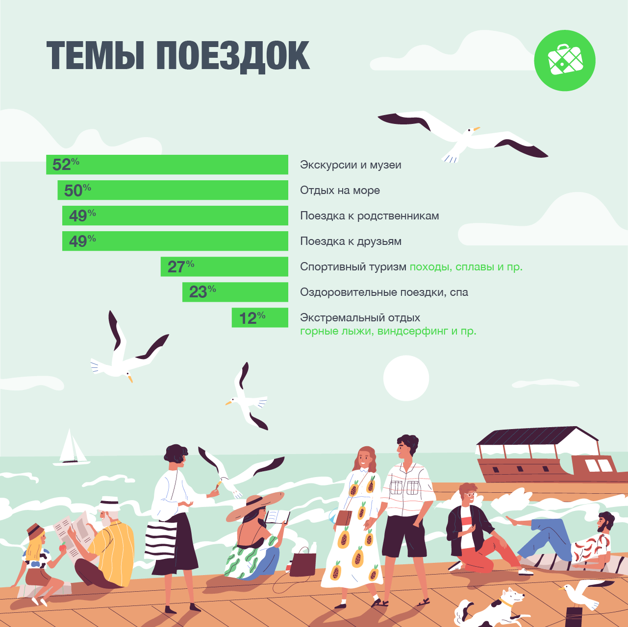 Думаете, что пляжный отдых пользуется наибольшим спросом, раз южные направления на первом месте? Не угадали. 52% опрошенных сказали, что им больше нравится ходить по музеям и ездить на экскурсии. Впрочем, не удивительно: крымские дворцы и парки прекрасны, а в районе Сочи особо популярны олимпийские объекты.