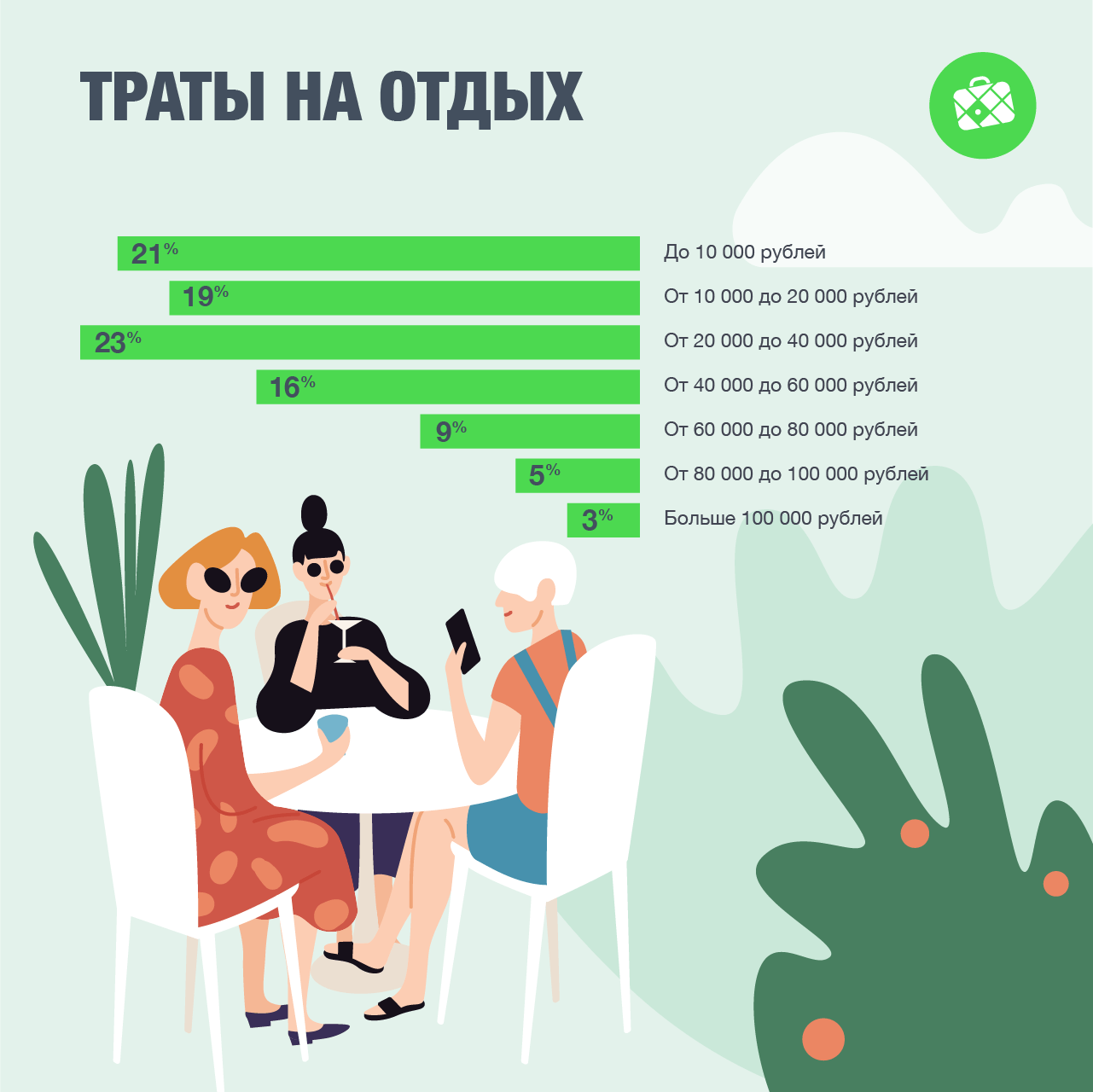 Каждый пятый респондент уложился в 10 тысяч рублей. 23% ответили, что путешествие обошлось им в сумму от 20 до 40 тысяч рублей. Больше 60 тысяч потратили 14%. А для 3% отпуск встал больше чем в 100 тысяч рублей.