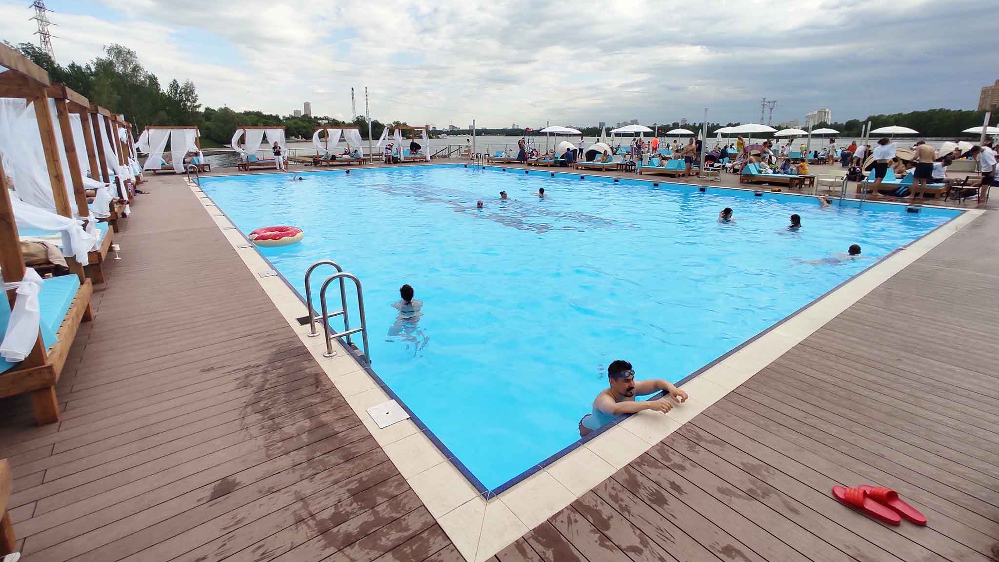 Новинка купального сезона-2021. У реконструированного Речного вокзала теперь работает зона отдыха. Здесь купаются, но не в канале имени Москвы, он судоходный, а в бассейнах. В холодную погоду вода подогревается. В выходные лежаки быстро раскупают, остаются только дорогостоящие диваны и кресла. На территории есть ресторан и коктейльный бар.