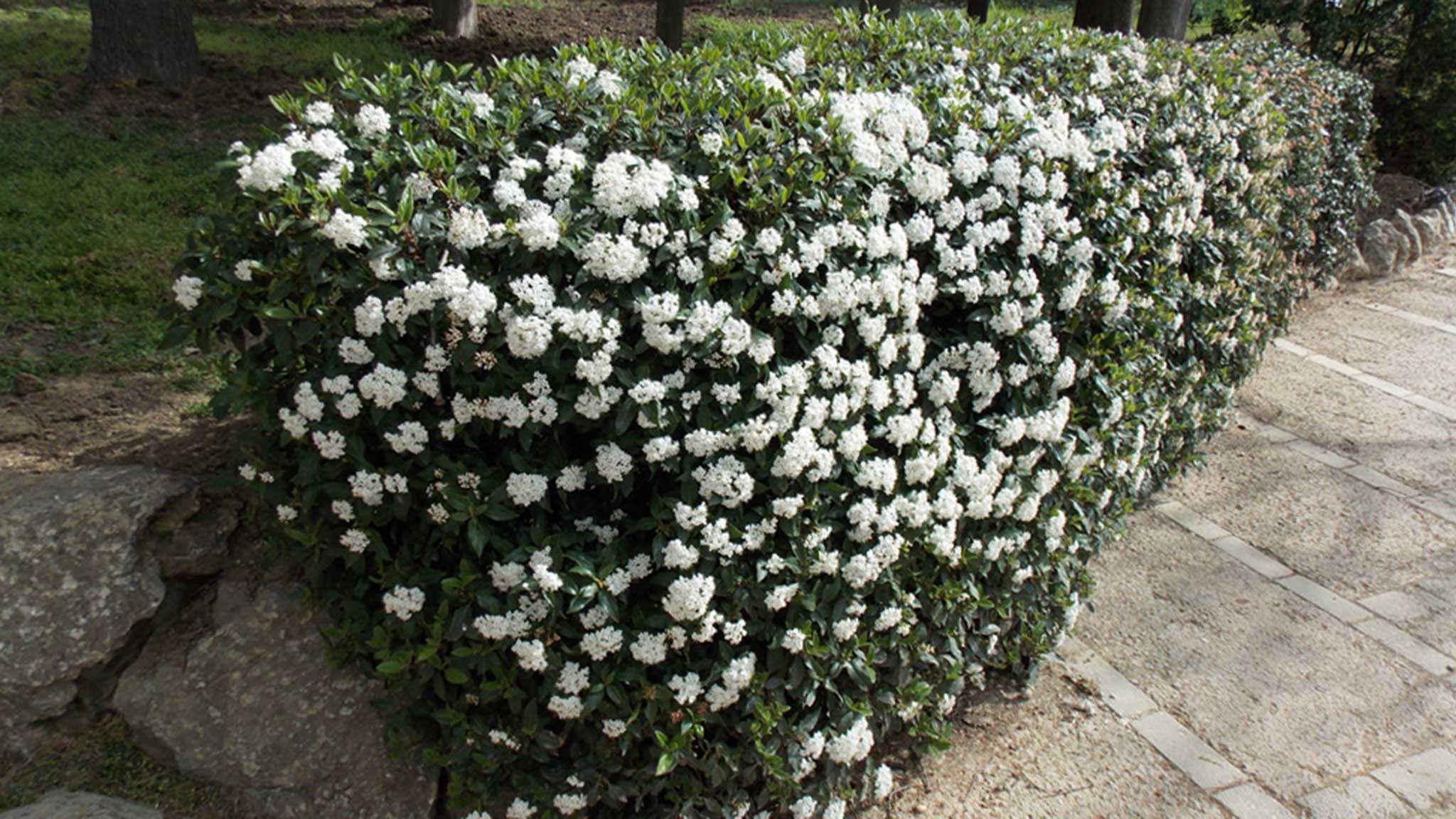 Недалеко от саркококки раскинулись кусты калины лавролистной, цветы которой напоминают попкорн или пушистый хлопок. Пышные букетики мелких белоснежных цветов издают тонкий аромат.