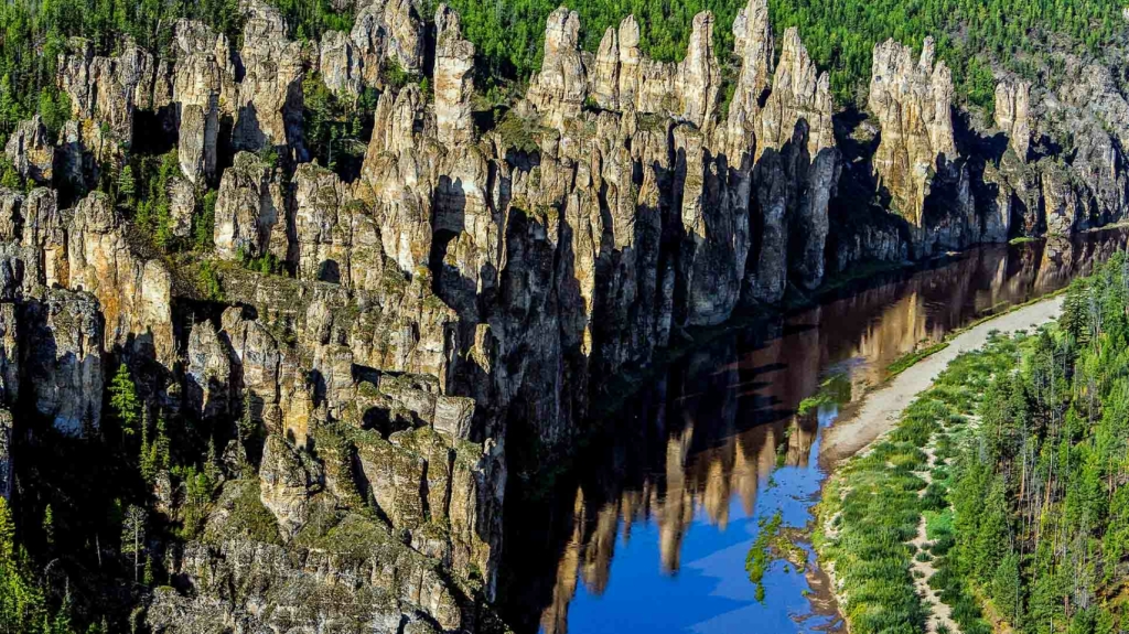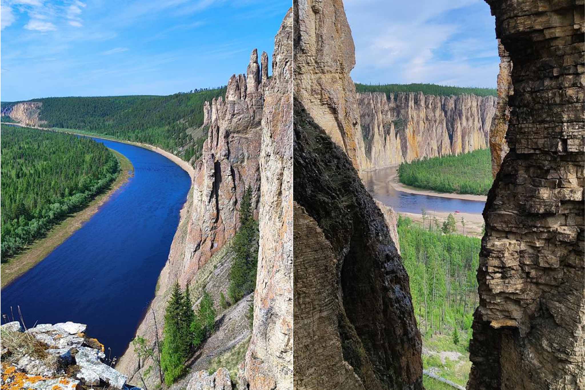 Синюю (по-якутски Сиинэ) не зря называют одной из самых красивых рек Саха. По ее берегам встречается около четырех десятков групп величественных скал высотой с 60-этажные небоскребы. Двухсоткилометровый сплав «КП» пройдет, в основном, вдоль Синских столбов. Они образовались тут в результате процессов выветривания и эрозии в течение последних четырехсот тысяч лет. Этих исполинов здесь заметно больше, чем на берегах полноводной Лены, в которую несет свои воды Синяя. Впрочем, и Синские, и Ленские столбы являются одним общим нацпарком Саха и объектом всемирного наследия ЮНЕСКО. По якутским поверьям, тут жили боги, и по сей день здесь сохранились петроглифы бронзового века — наскальные изображения людей и животных.