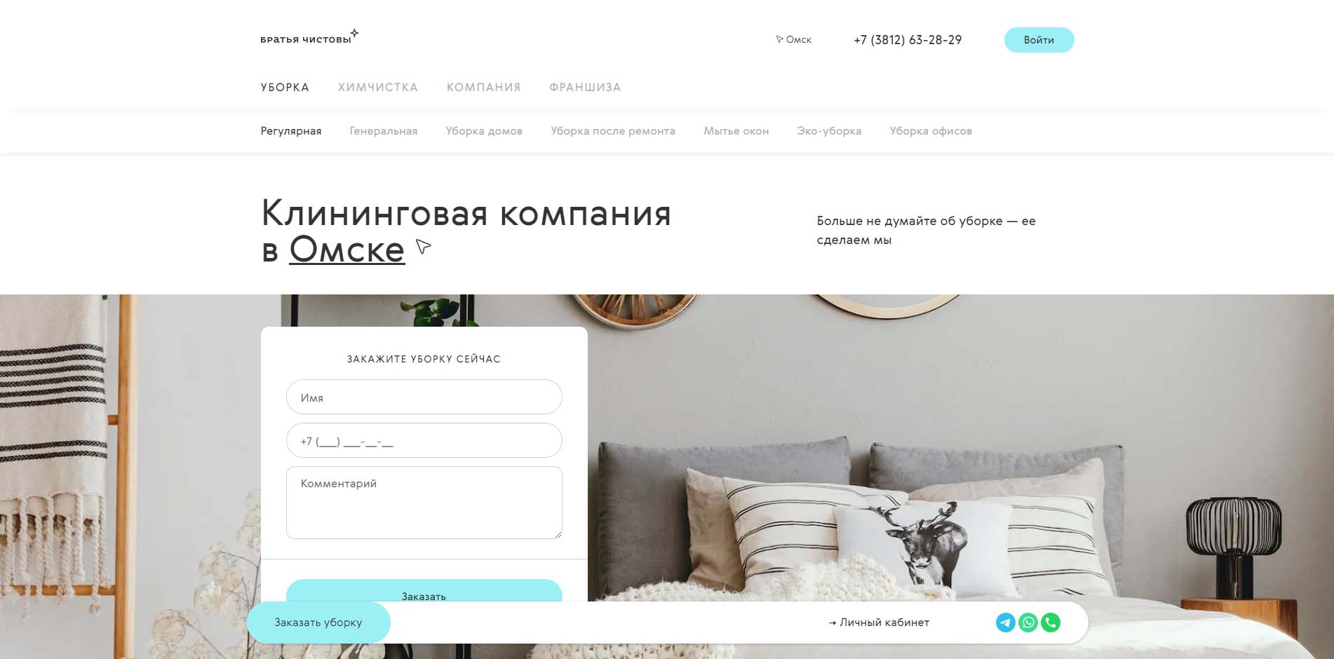 Омский филиал крупной сети клининговых сервисов, работающих на территории России и за рубежом. Помимо стандартных услуг, входящих в уборку помещения, оказывают дополнительные — глажка вещей или смена постельного белья, например. Могут сделать предварительную оценку стоимости уборки по фотографии помещения. Есть собственное мобильное приложение.