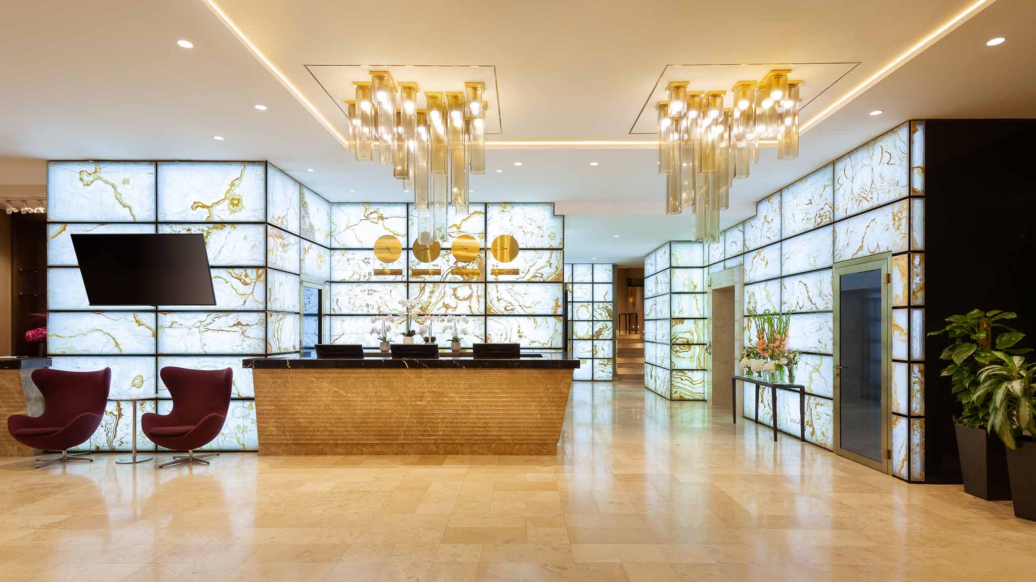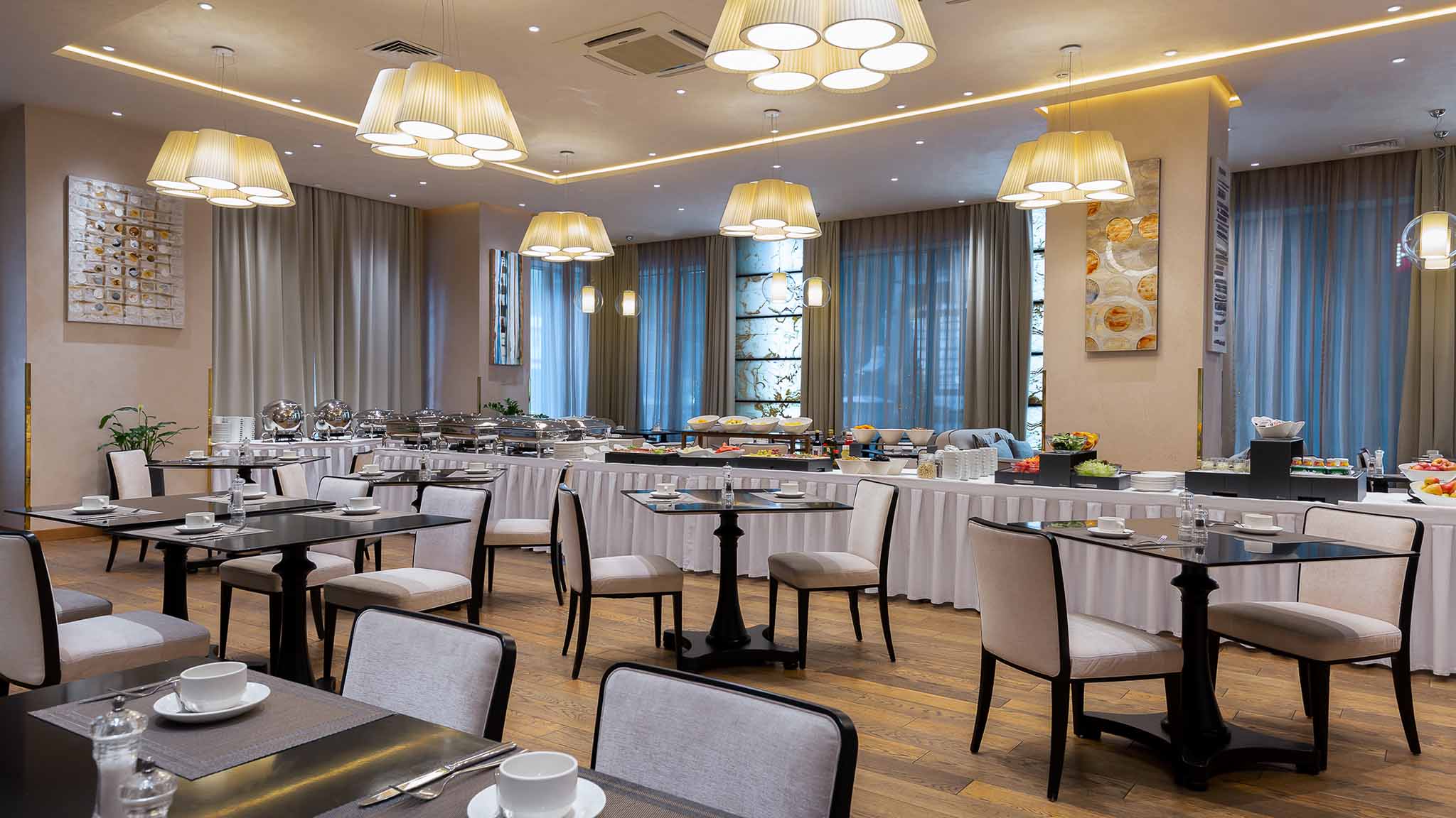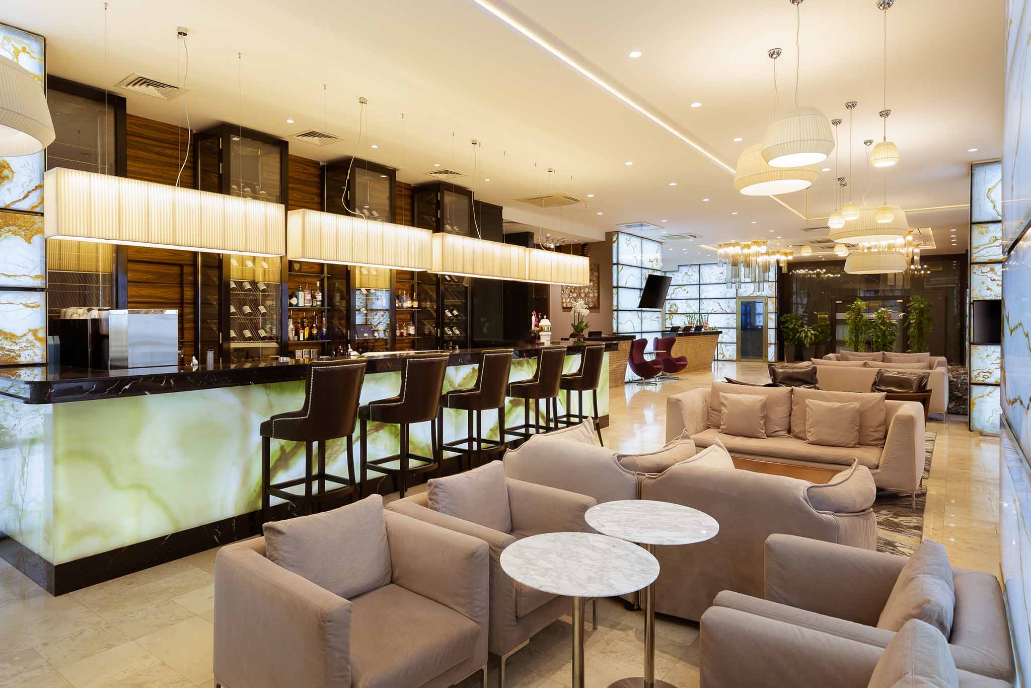 Обсудить с деловым партнером планы, провести бизнес-ланч можно в Onyx Bar. Дизайн-проект заведения в неоклассическом стиле: витражные стены из оникса и мраморная отделка, музыкальные фортепианные импровизации в исполнении пианистов-таперов и современное арт-пространство в лобби.