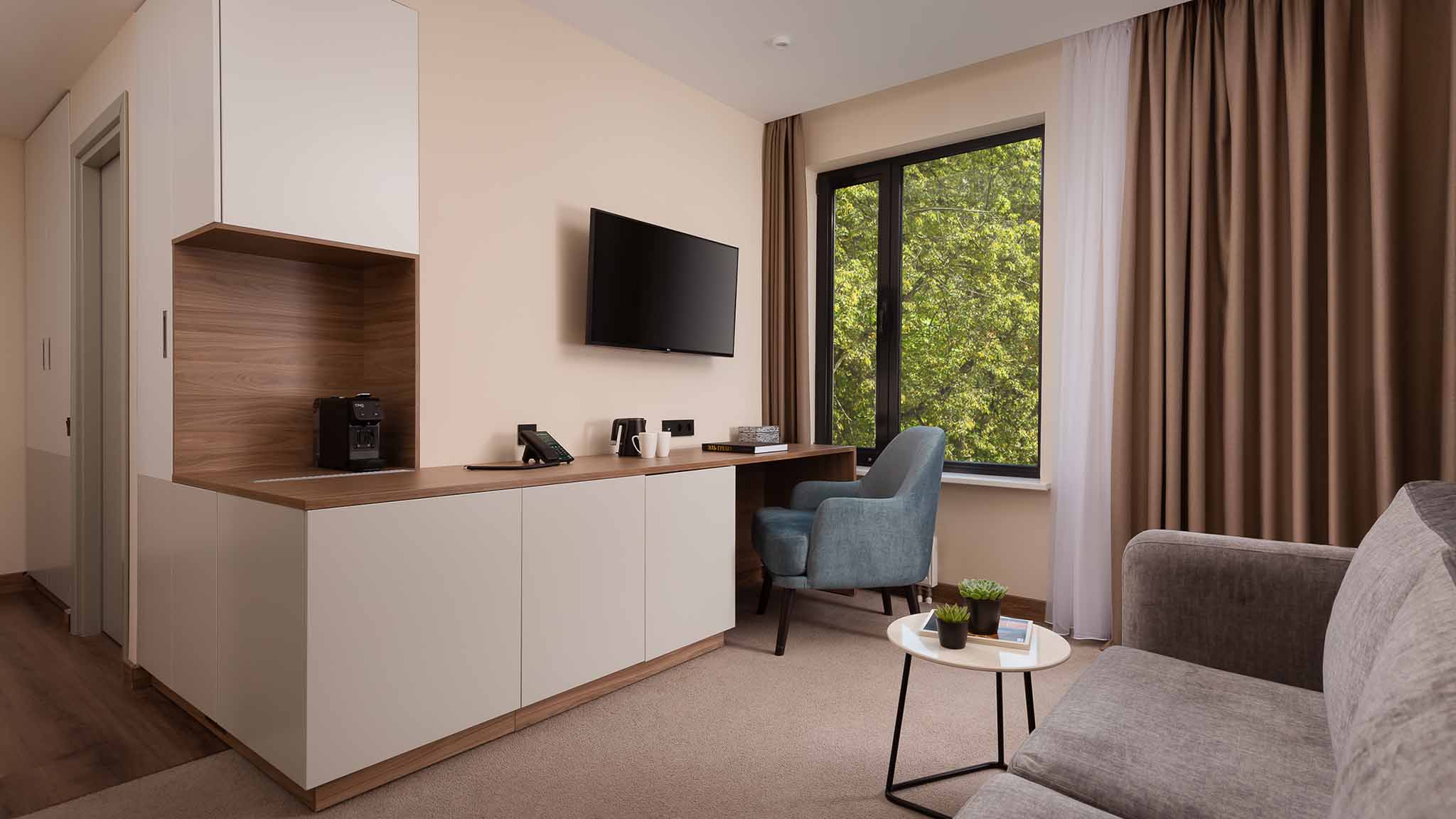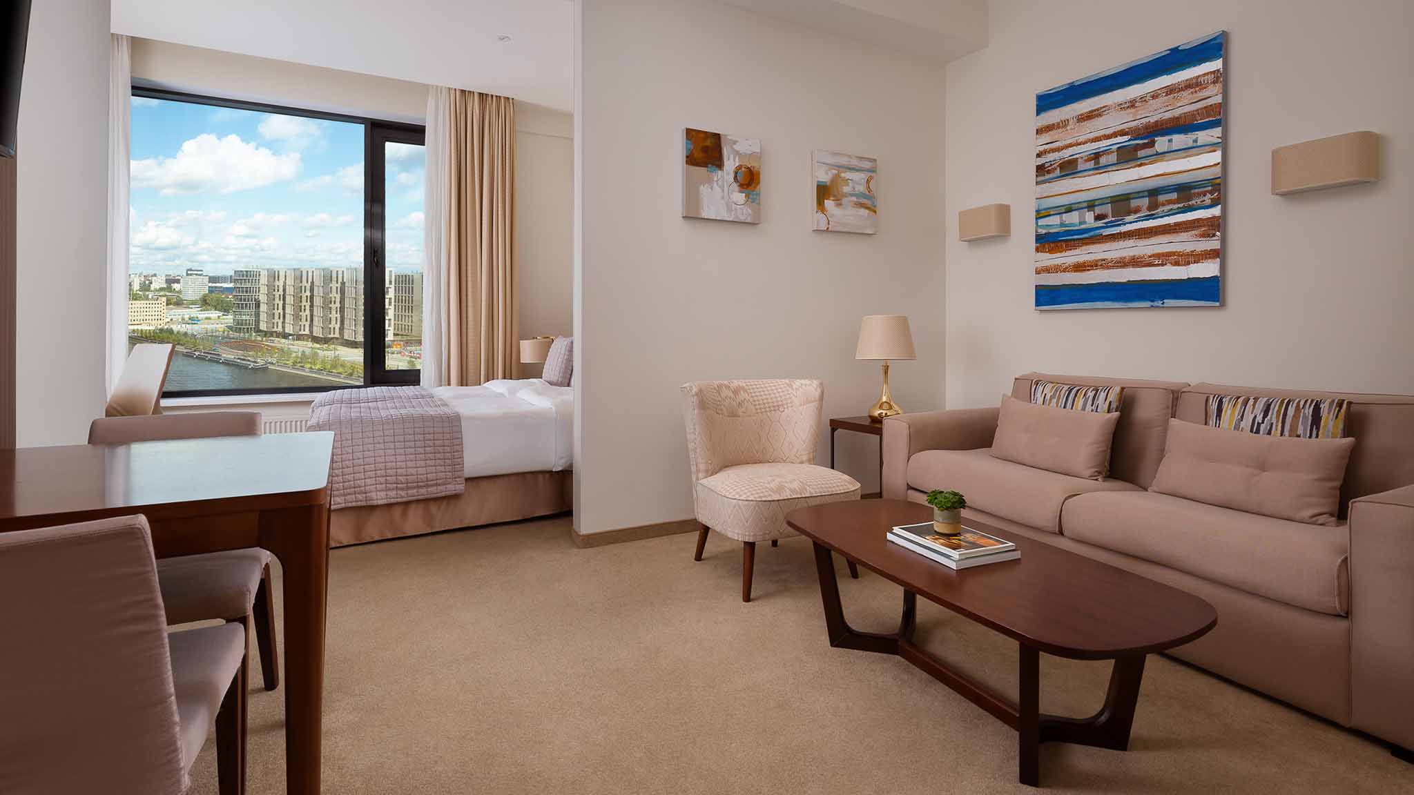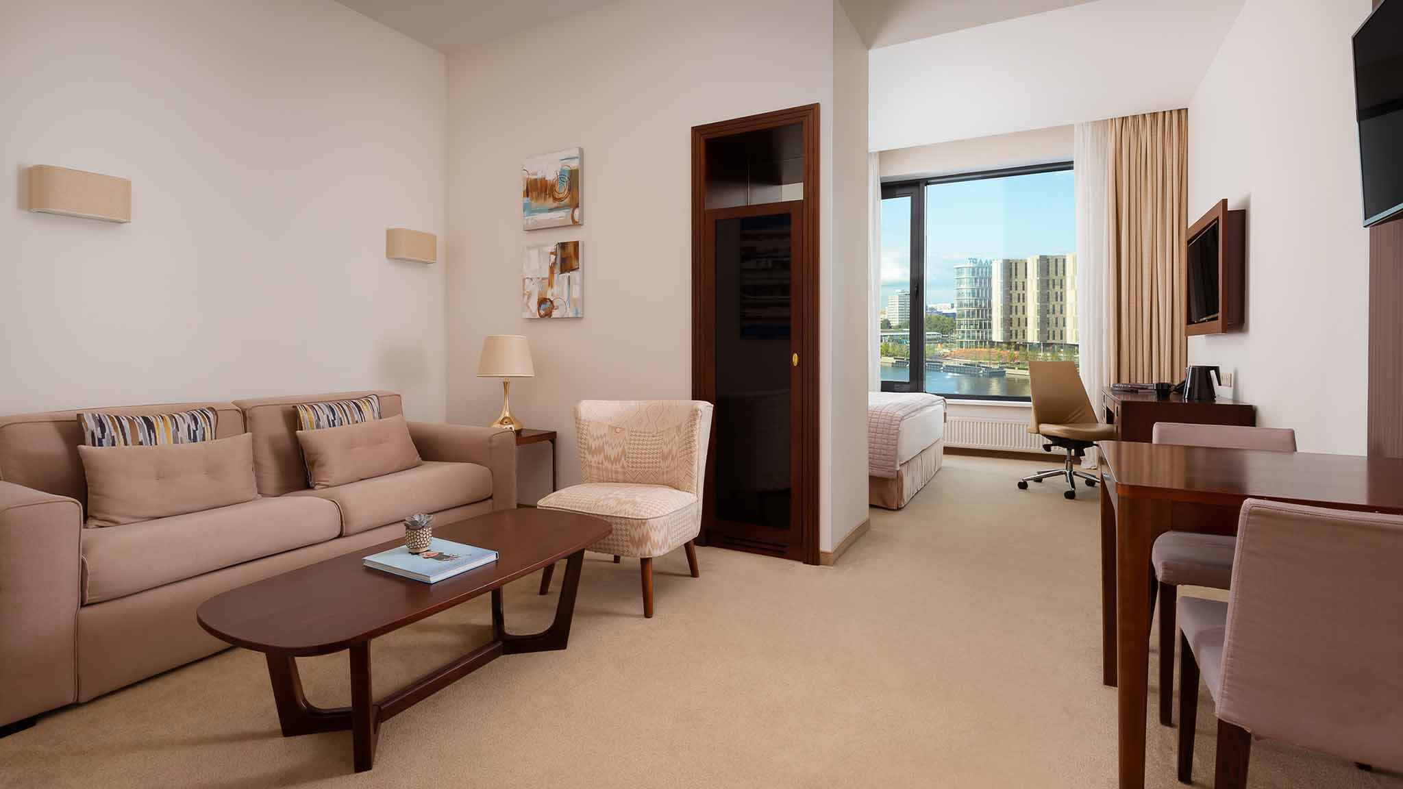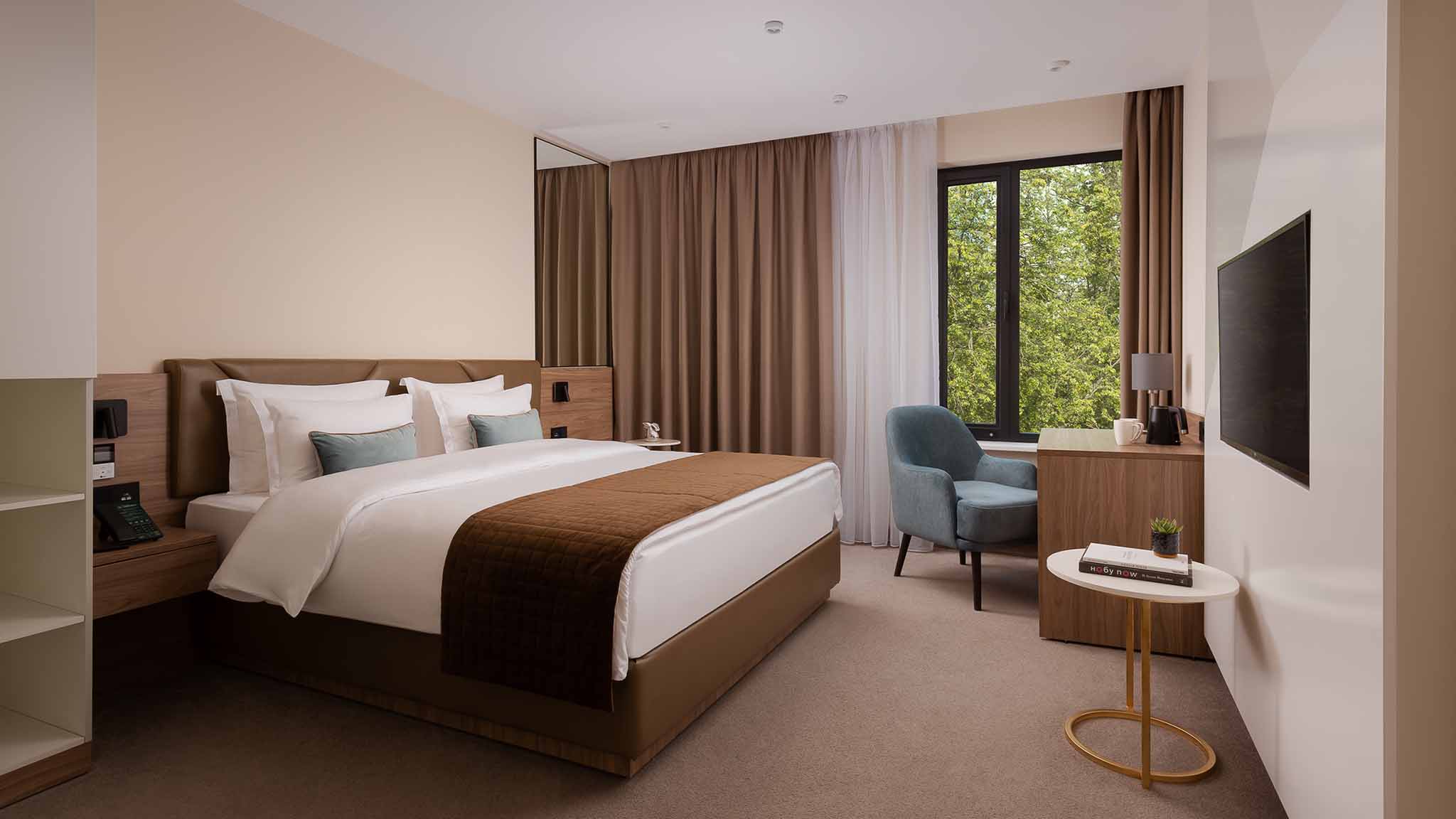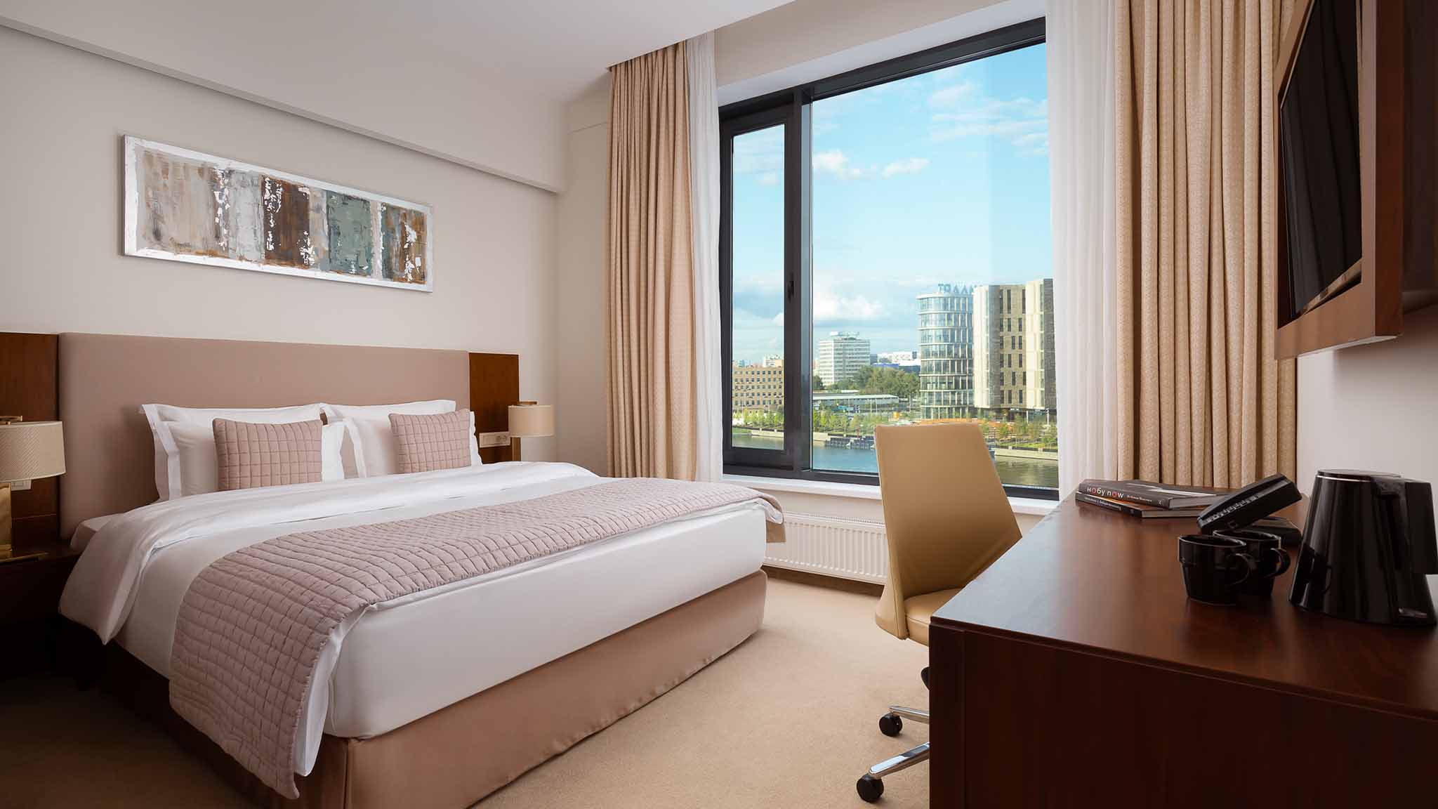 Для бронирования доступен 221 номер. Все видовые. Категории: от демократичного «Стандарта», «Супериор», «Студий» до апартаментов, «Люксов» и «Бизнес Сюита» — для тех, кто в деловых поездках и туристических путешествиях привык к определенному уровню комфорта.