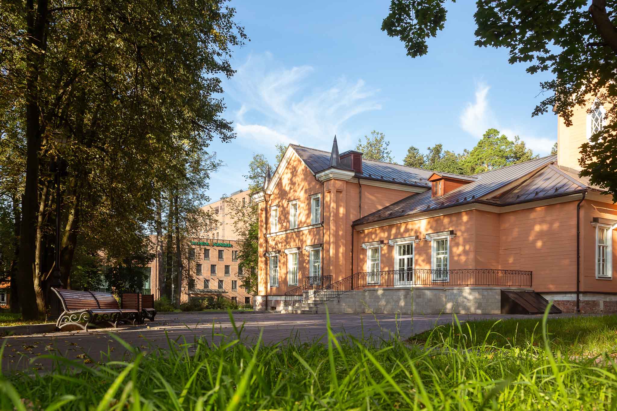 Гостиничный комплекс со всех сторон окружен лесистым Тимоховским парком. Всего в 4 км от Москвы можно ощутить единение с природой и устроить детокс от шумного мегаполиса. 144 номера трех категорий — «Стандарт», «Полулюкс» и «Люкс» — круглый год принимают гостей. В интерьере только натуральные оттенки и природные материалы, много естественного света.