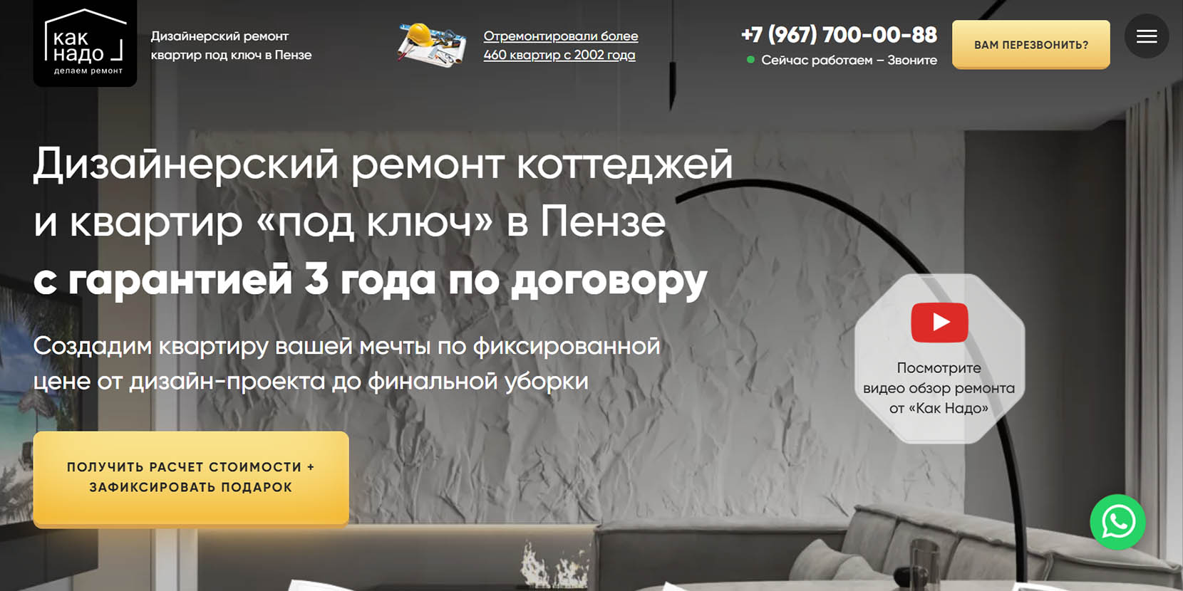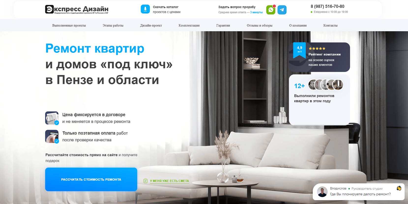 Филиал федеральной сети студий дизайна и ремонта. Изначально занимались исключительно разработкой дизайн-проектов, постепенно сформировали команду и стали делать ремонты «под ключ». Эффективно организуют пространство и продумывают комфорт каждого квадратного метра. Сотрудничать с компанией можно удаленно из любой точки мира — на каждом объекте устанавливаются круглосуточно работающие камеры. На сайте есть фотоотчеты выполненных в Пензе ремонтов за последний год с указанием площади квартир, сроков и стоимости.