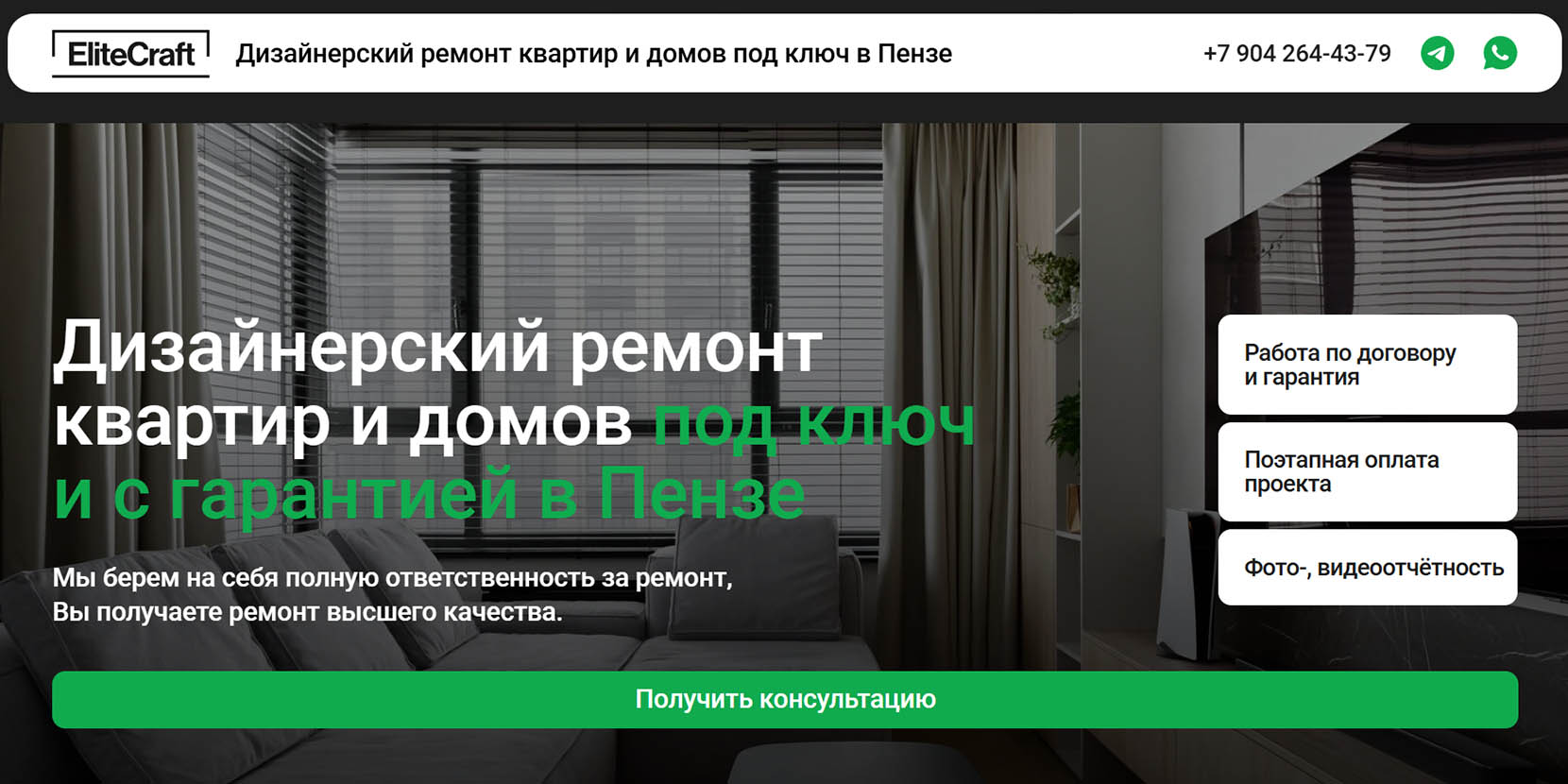 В компании работают специалисты различных профилей: плиточники, плотники, монтажники, сантехники, электрики, отделочники с опытом от 8 лет. Все работы ведутся при постоянном контроле опытного прораба. В отличие от большинства коллег по цеху, здесь готовы взяться не только за комплексный ремонт квартиры, но и за точечный — например, отремонтировать только одну комнату. Нестандартные дизайнерские задумки также доступны для воплощения. Делают ремонты больше 15 лет, предоставляют гарантию 5 лет.