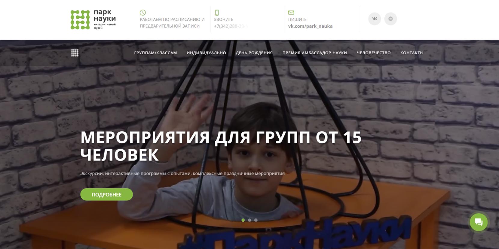 Продолжительность научной программы 1,5 часа. На территории парка нет кафе, поэтому фуршет лучше организовать в другом месте. В самом музее детей ждут только научные открытия.