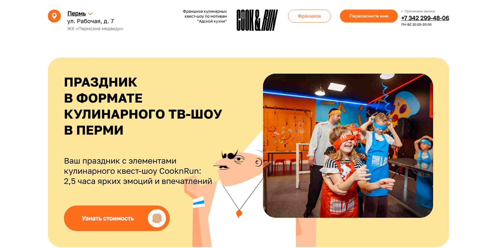 Кулинарное шоу длится 2,5 часа, в него входит аренда помещения, работа ведущих, ингредиенты и необходимая атрибутика для приготовления блюд. Дополнительно можно заказать фото и видео съемку, праздничный торт и украшение шарами.