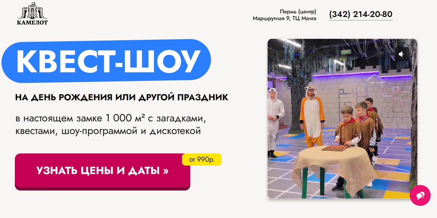 В средневековом замке «Камелот» витает дух приключений и настоящих подвигов. В сказочном королевстве ребят на каждом шагу ждут испытания: волшебный лес, огромные пазлы, полоса препятствий и невероятные загадки. Под руководством профессиональных актеров квест проходит ярко и незабываемо.