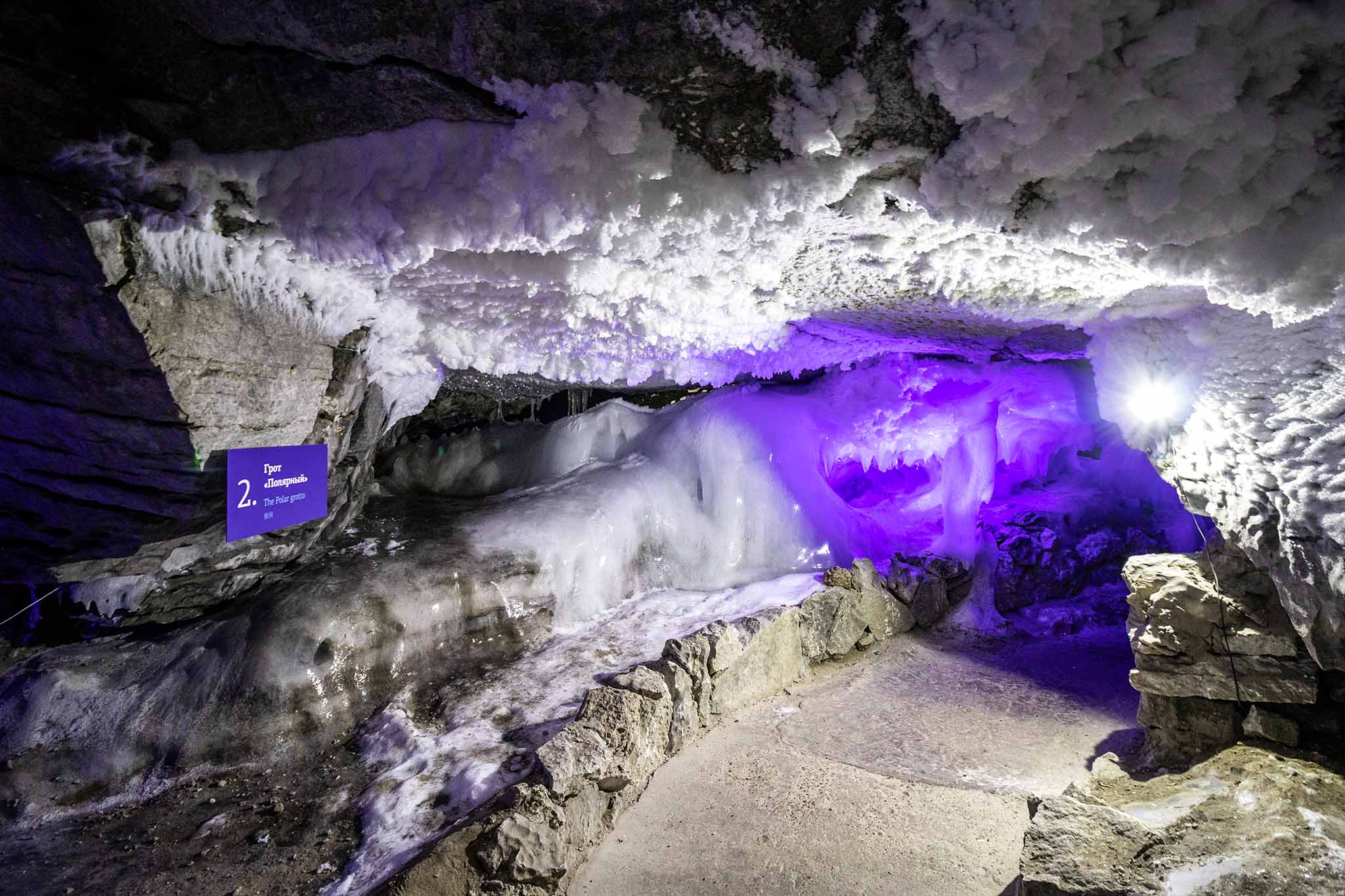 В гротах круглый год одинаковая температура от -5 до +5 градусов, даже летом! Поэтому надо иметь теплую одежду и обувь, если нет таковой, то у входа в пещеру есть прокат курток.