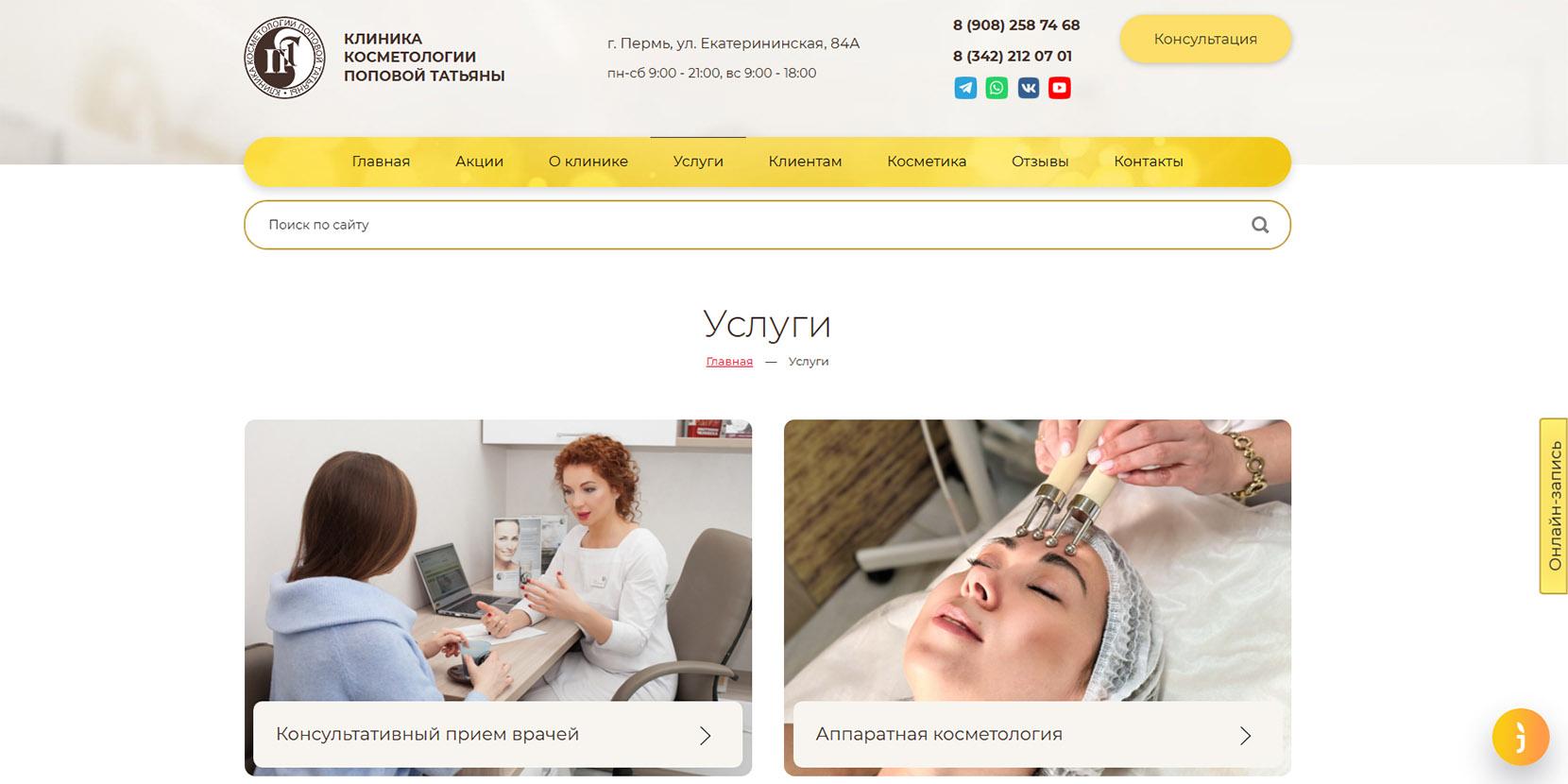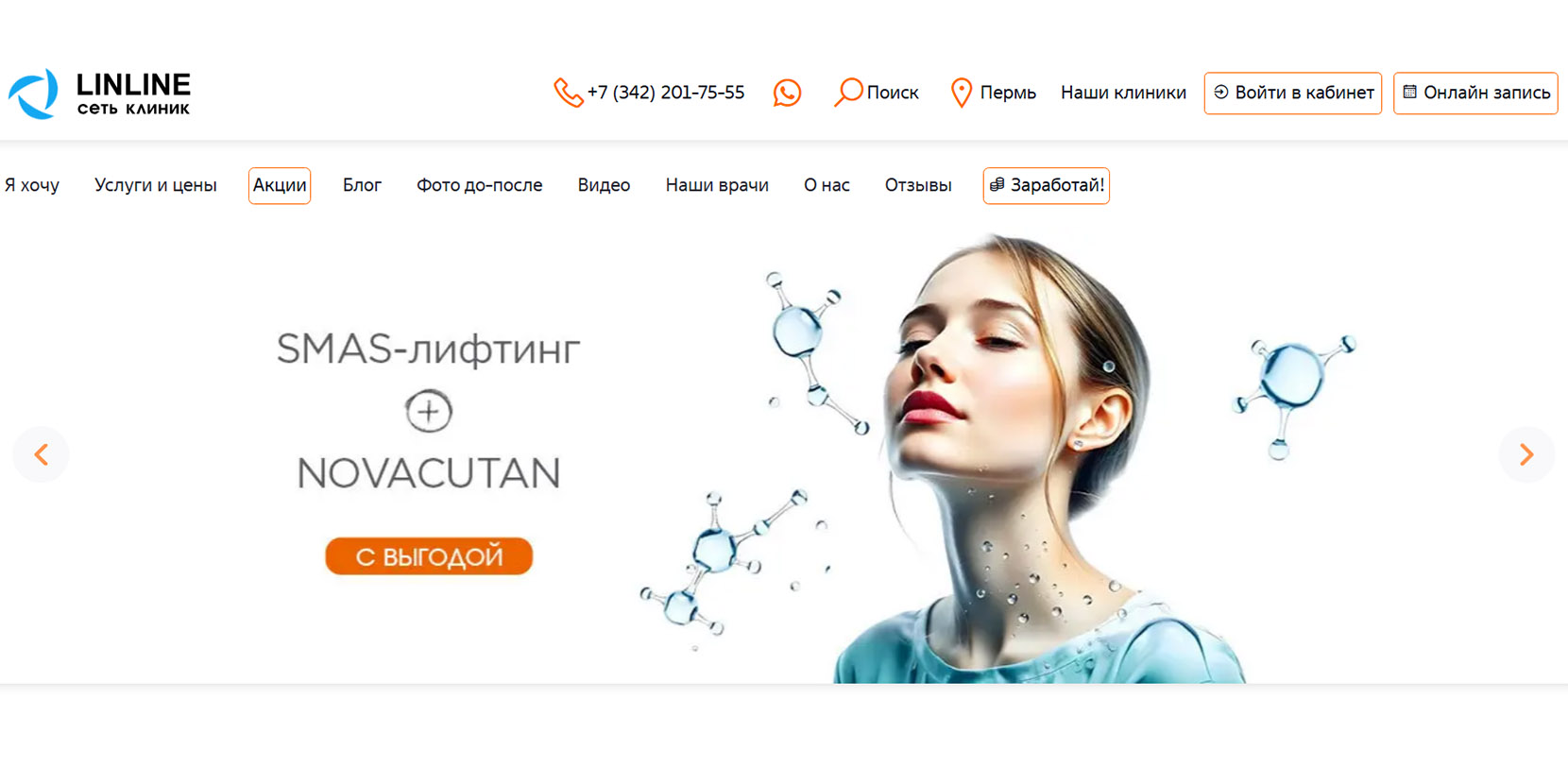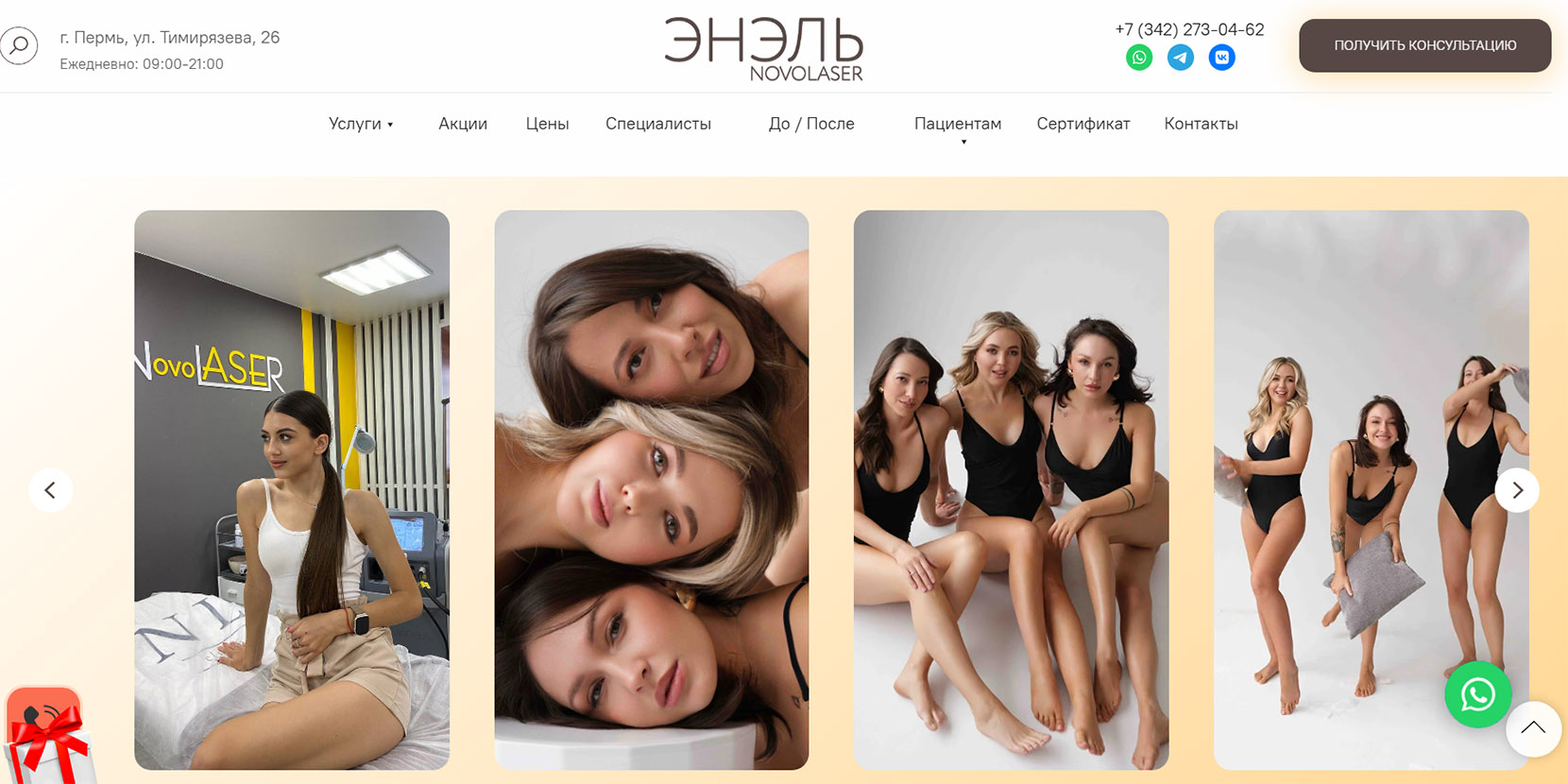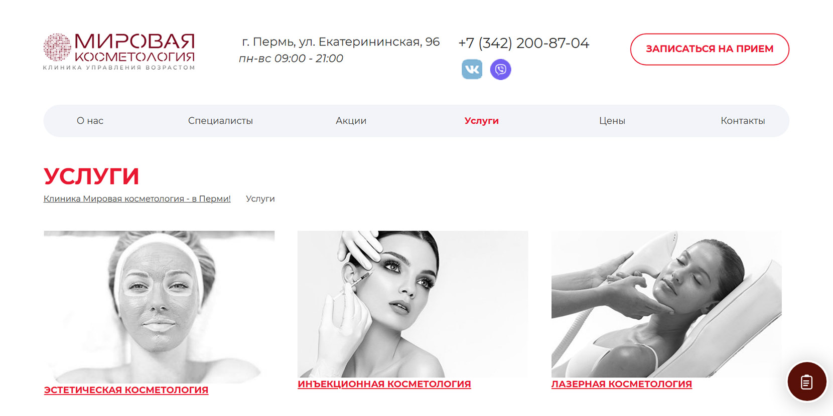 Часть крупной сети косметологических клиник, в Перми работает с 2010 года. Преимущественно специализируются на лазерной косметологии. Также клиентам здесь предлагают инъекционные процедуры, аппаратную косметологию и подбор лечебной косметики. Доступны онлайн-консультации по видеосвязи, если нет возможности приехать очно.