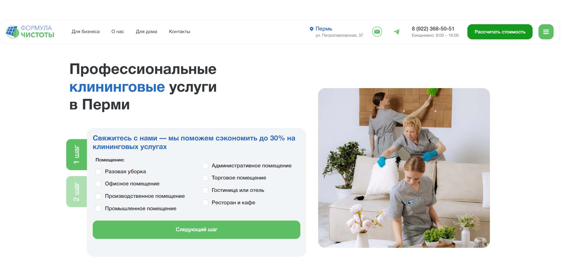 Компания работает с 2018 года и оказывает любые услуги по уборке, вплоть до мытья подъездов, клининга бассейнов и транспорта. Есть возможность рассчитать стоимость работ онлайн, а клинеры в большинстве случаев готовы выехать на объект прямо в день обращения. На каждый объект назначается бригадир, который лично отвечает за качество и сдает результат клиенту.