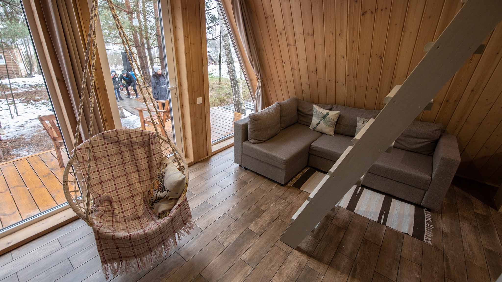 На верхней части склона построены новые комфортные коттеджи с панорамными окнами и всеми удобствами. Домики рассчитаны на компании 4-8 человек. Аренда коттеджа — от 12 000 рублей в сутки.