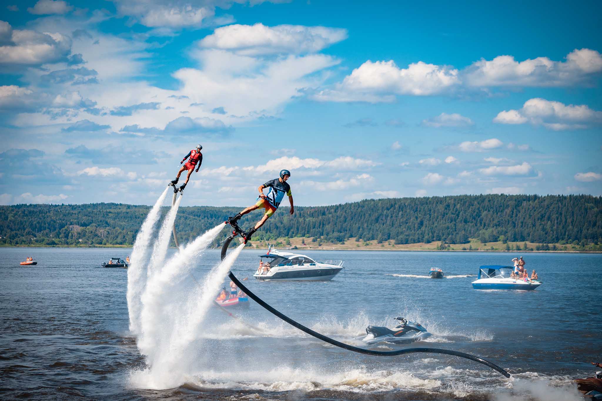 В фестивале принимают участие спортсмены-любители и профессионалы. Здесь можно увидеть не только зрелищные соревнования и шоу на гидроциклах, флайбордах, но и необычные турниры, такие, как гонки на снегоходах по воде. Привлекают внимание и самодельные плавательные средства: корабль-диван, лодки из пустых пластиковых бутылок или металлических бочек, своеобразные байдарки и плоты.