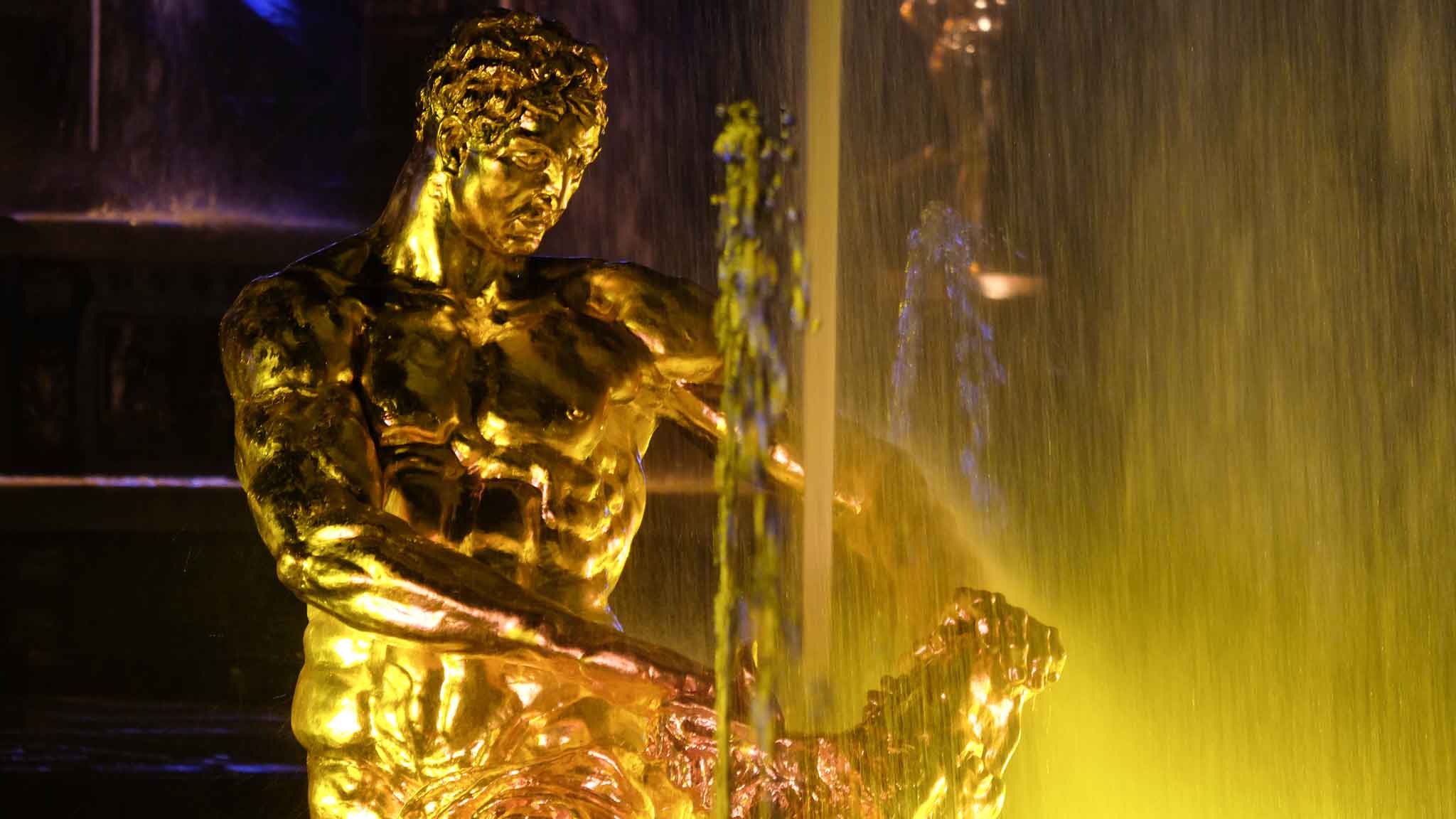 Бронзовая позолоченная фигура является символом победы русской армии в Полтавской битве. Герой силой разрывает пасть льва. Эту картину сопровождает водомет высотой около 20 метров, символизирующий его последний глухой рев.