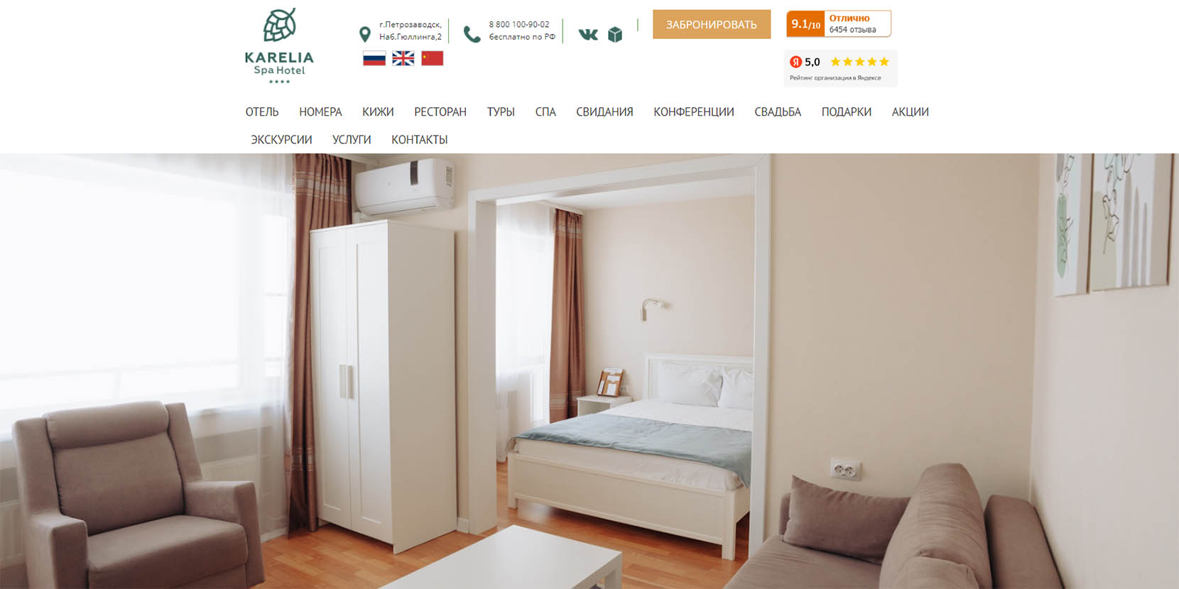 Отличное место для тех, кто любит совмещать активный отдых с неспешным релаксом в спа. Отель расположен в тихом месте, недалеко от исторического центра города. Гостям предлагают номера разных категорий, а также посещение бассейна и сауны и спа-центра. Также постояльцы могут выбрать экскурсии по Карелии. В стоимость проживания включен завтрак в формате «шведского стола».